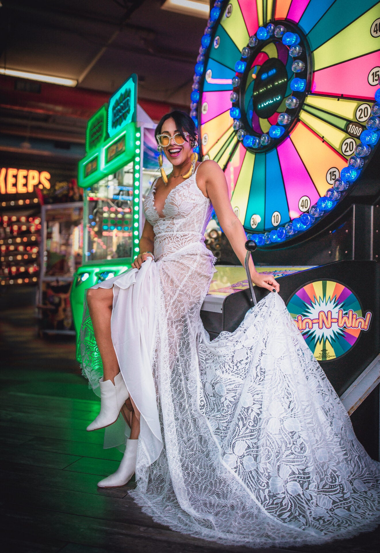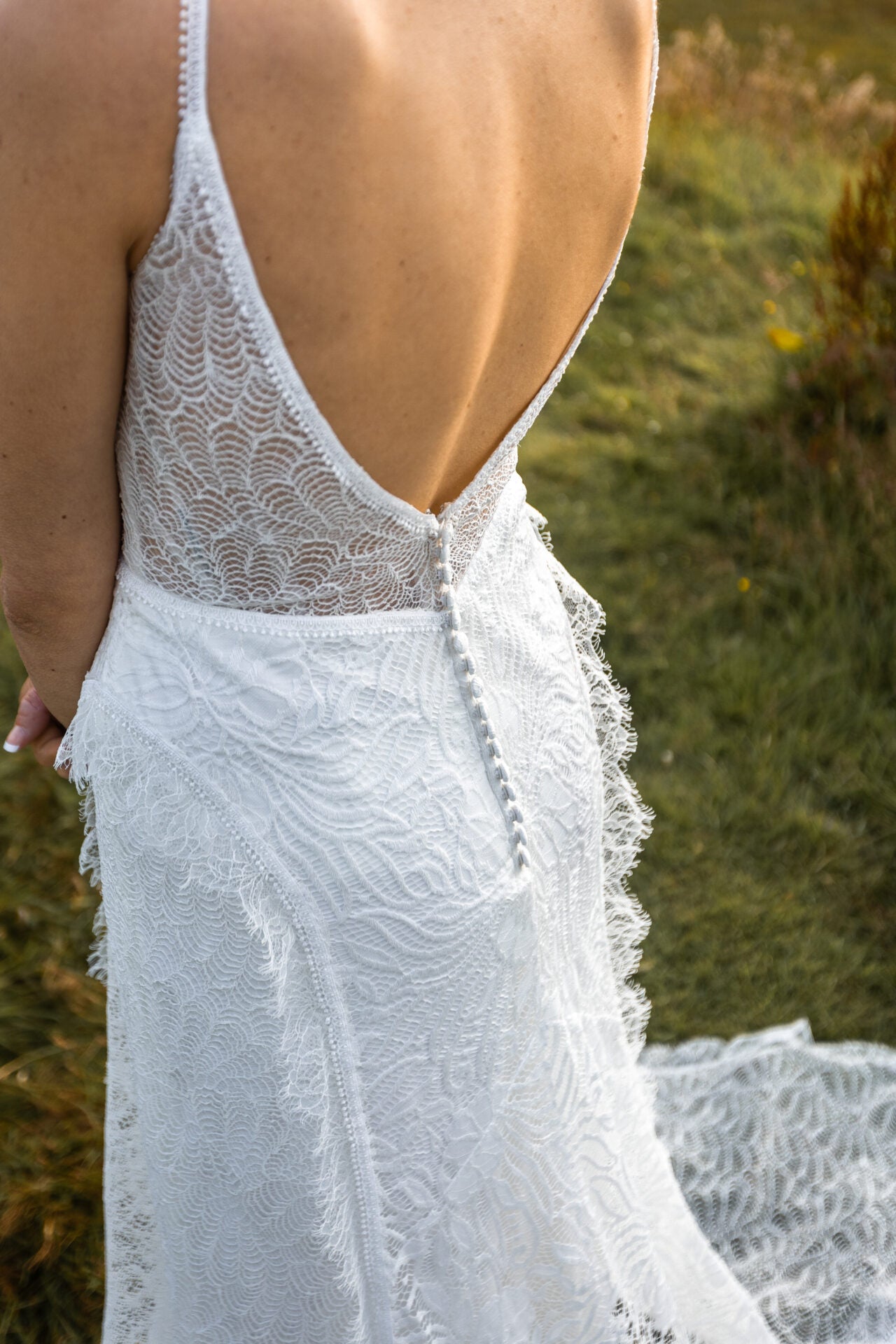 Fun and flirtatious, the franki gown brings those free-spirited vibes to life in a sexy fit-and-flare wedding gown. From thin lacy spaghetti straps, the lined bodice dives into a deep plunging V-neckline outlined in the organic lace edges of the allover matte leafy lace. A deep V-back detail complements the neckline and meets a subtle row of timeless fabric-covered buttons. At the hip, frilled lace trim accents accentuate the fitted hip with contrasting contoured seaming and flare into whimsical tulle gussets before meeting a sheer lace train. For the fashion-forward and free-spirited bride, this casual boho wedding dress is truly one-of-a-kind.