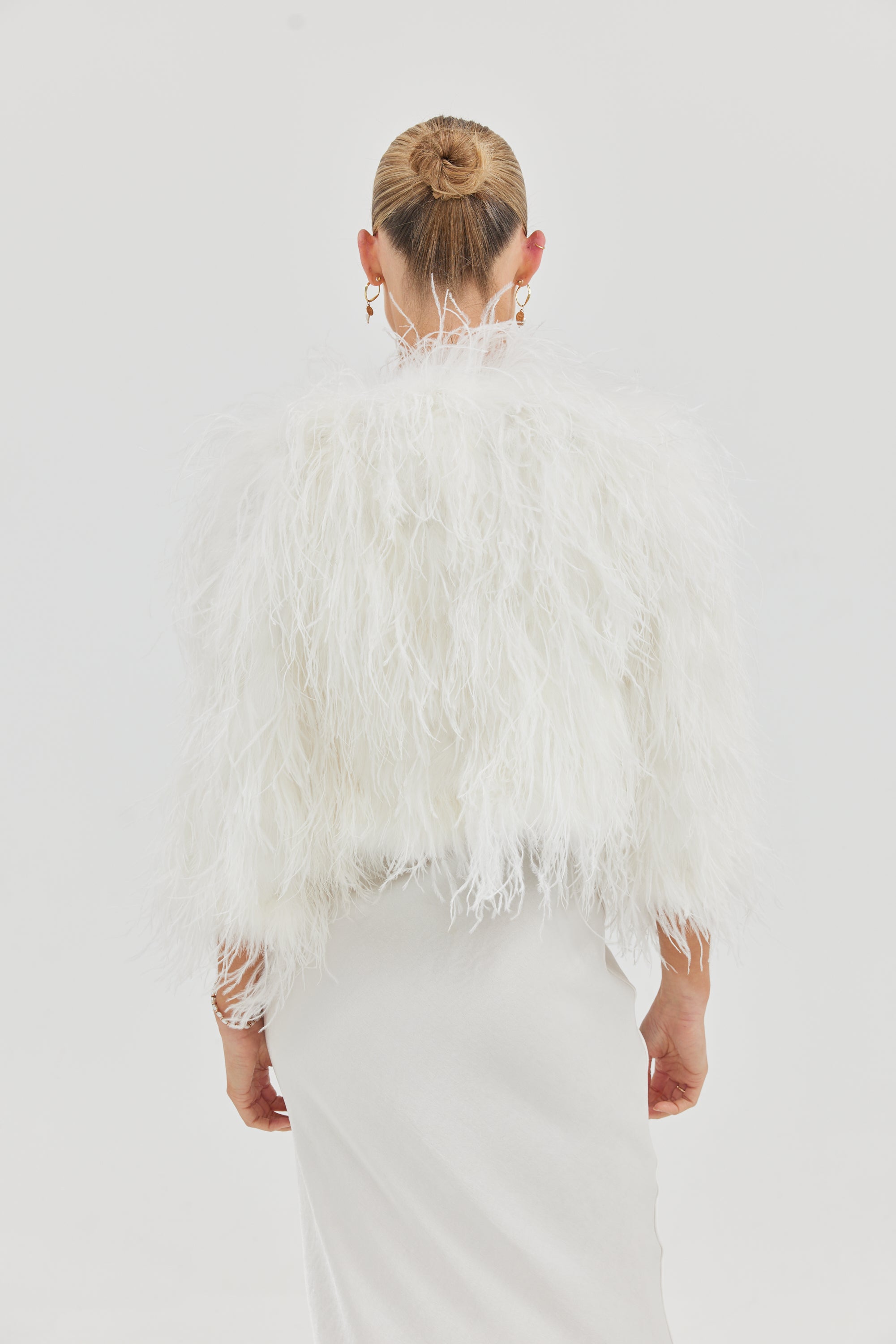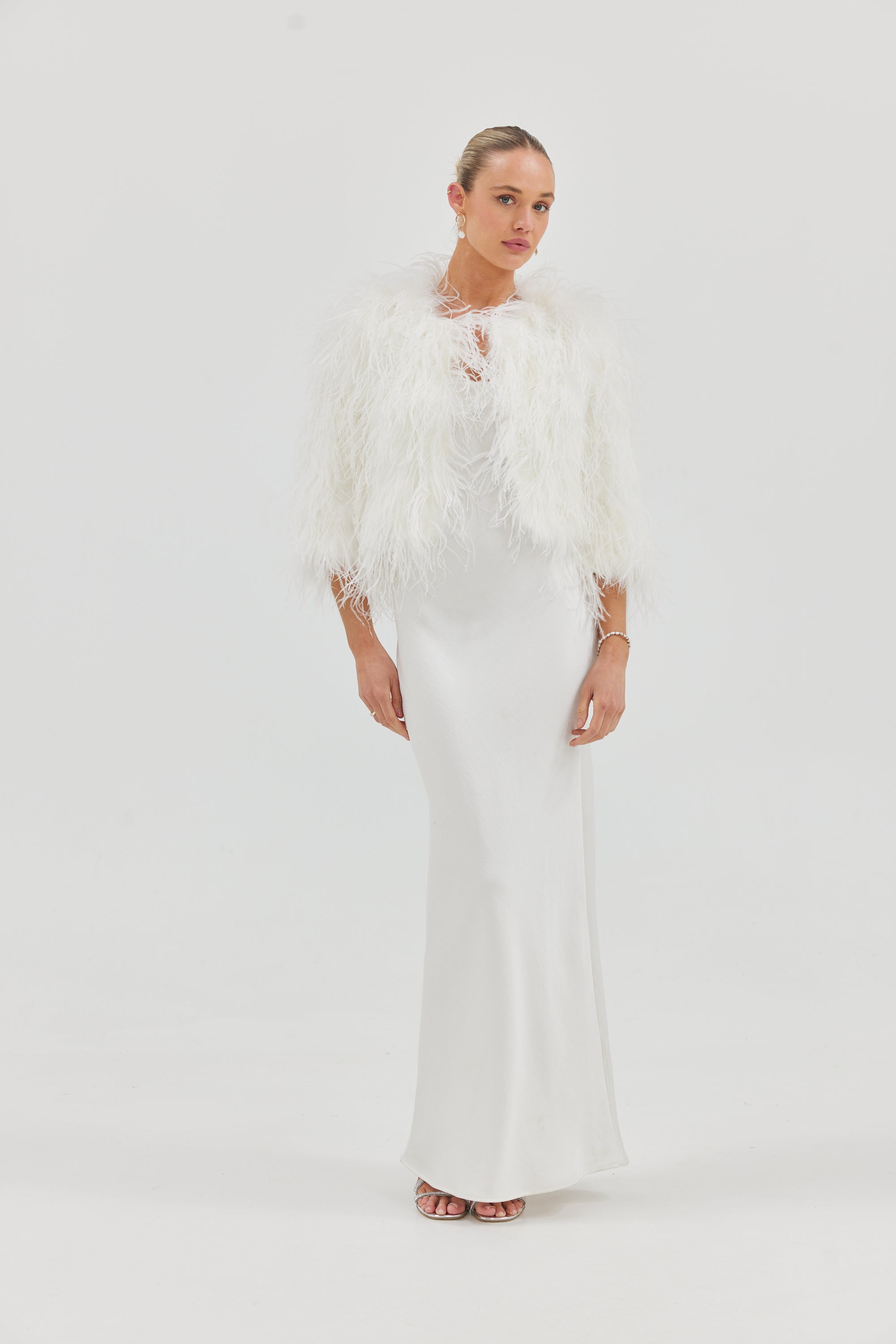 The Dahlia Feather Jacket has been a favourite with bride’s year after year. Handmade with whimsical Ostrich Feather, this cropped sleeve jacket is the most perfect piece for your wedding day or special occasions.
