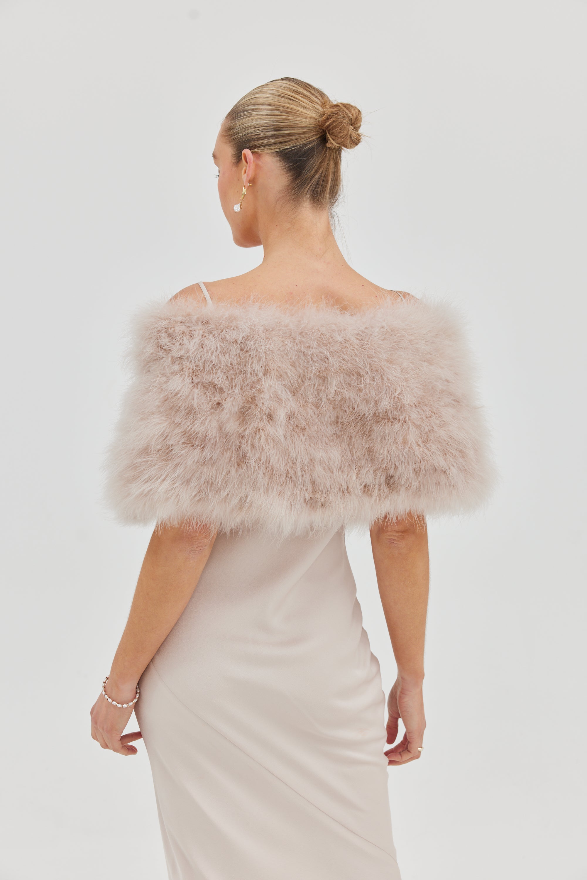 The Lottie Wrap is the perfect accessory for lavish events. This chic wrap is composed of up-cycled Marabou Feather and sits elegantly over the shoulders with a fastening at the front for closure.