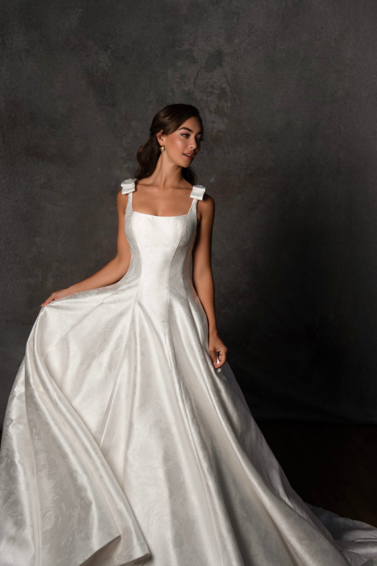 Satin Jacquard A-Line Wedding Dress with Shoulder Bows and Scoop Neckline