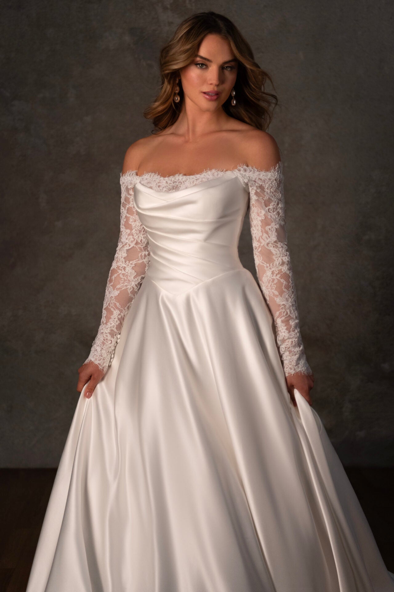 Style D4457 offers a soft vintage revival with its layered texture and refined silhouette. The wrapped grand satin bodice reveals a delicate lace peekaboo beneath, adding depth and romance to the design. A clean, flowing A-line skirt balances the detailed top, while long sheer lace sleeves bring classic elegance. The scoop neckline enhances the feminine feel, and subtle ruching throughout the bodice adds gentle shaping. This gown brings together timeless beauty and modern softness, ideal for the bride seeking understated sophistication. Also available in plus sizes.