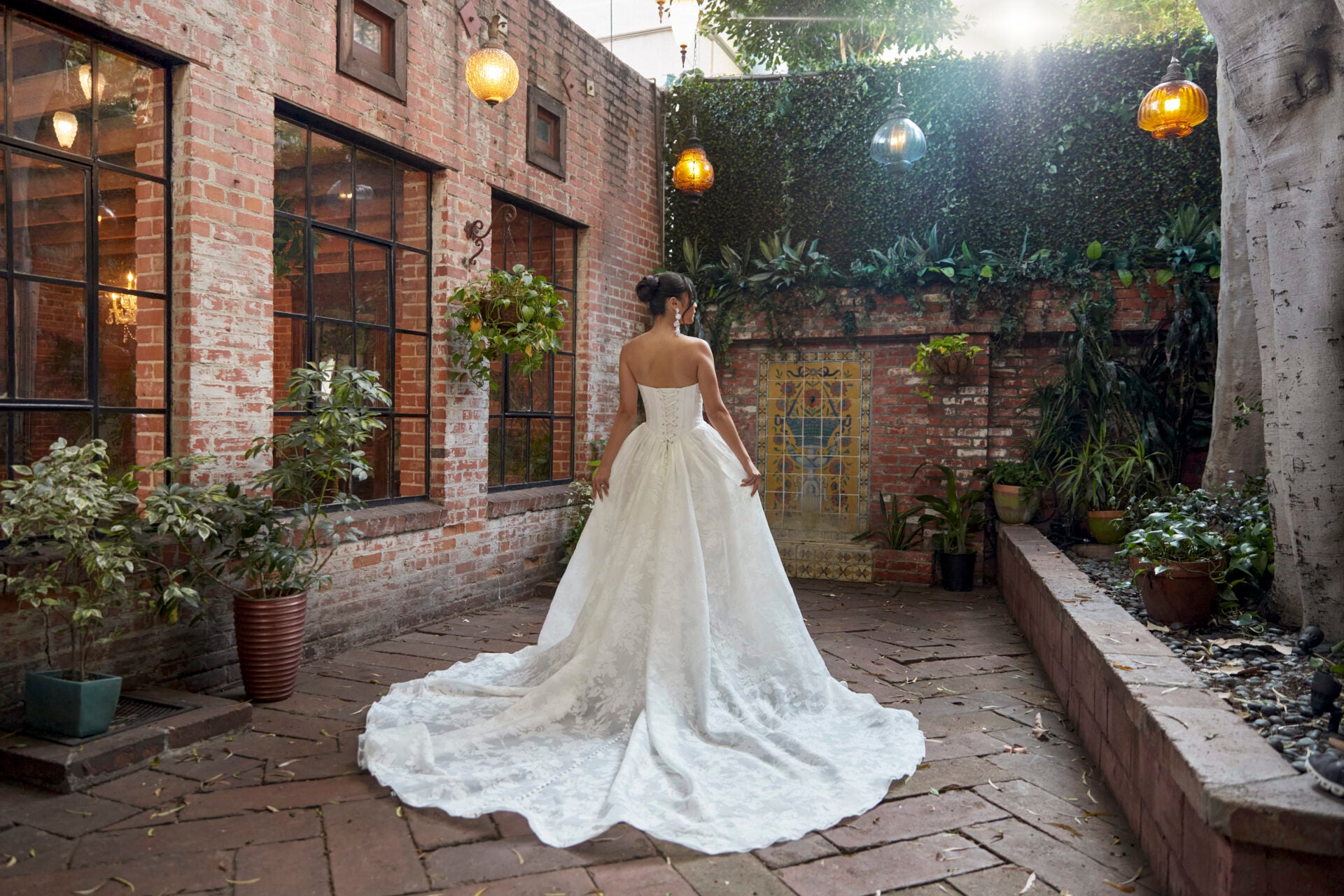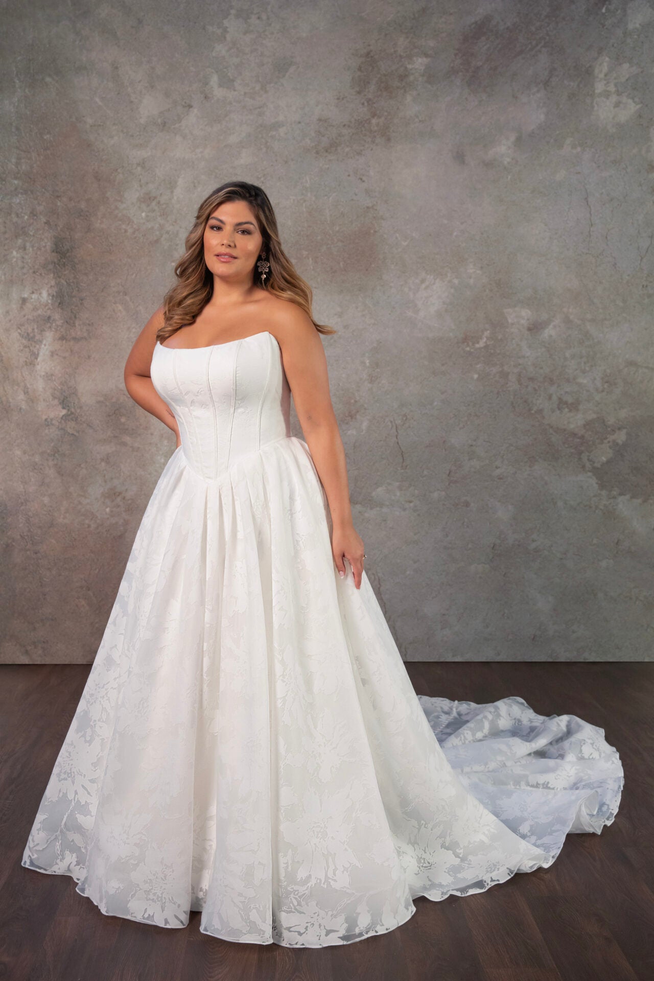 A modern princess wedding gown comes to life in Style D4158. Featuring a strapless scoop neckline bodice with vertical contouring seams, the fully-lined bodice accentuates the figure while complementing the romantic Basque waist. The back showcases a timeless lace-up detail, adding a touch of old-world charm. From the waist, a full and romantic ballgown skirt billows in a one-of-a-kind textured organza, complete with pockets and long regal train. This enchanting gown beautifully balances modern design with classic bridal elegance for an ultra-romantic ballgown wedding dress made for a fairytale wedding. This wedding gown is also available in plus sizes.