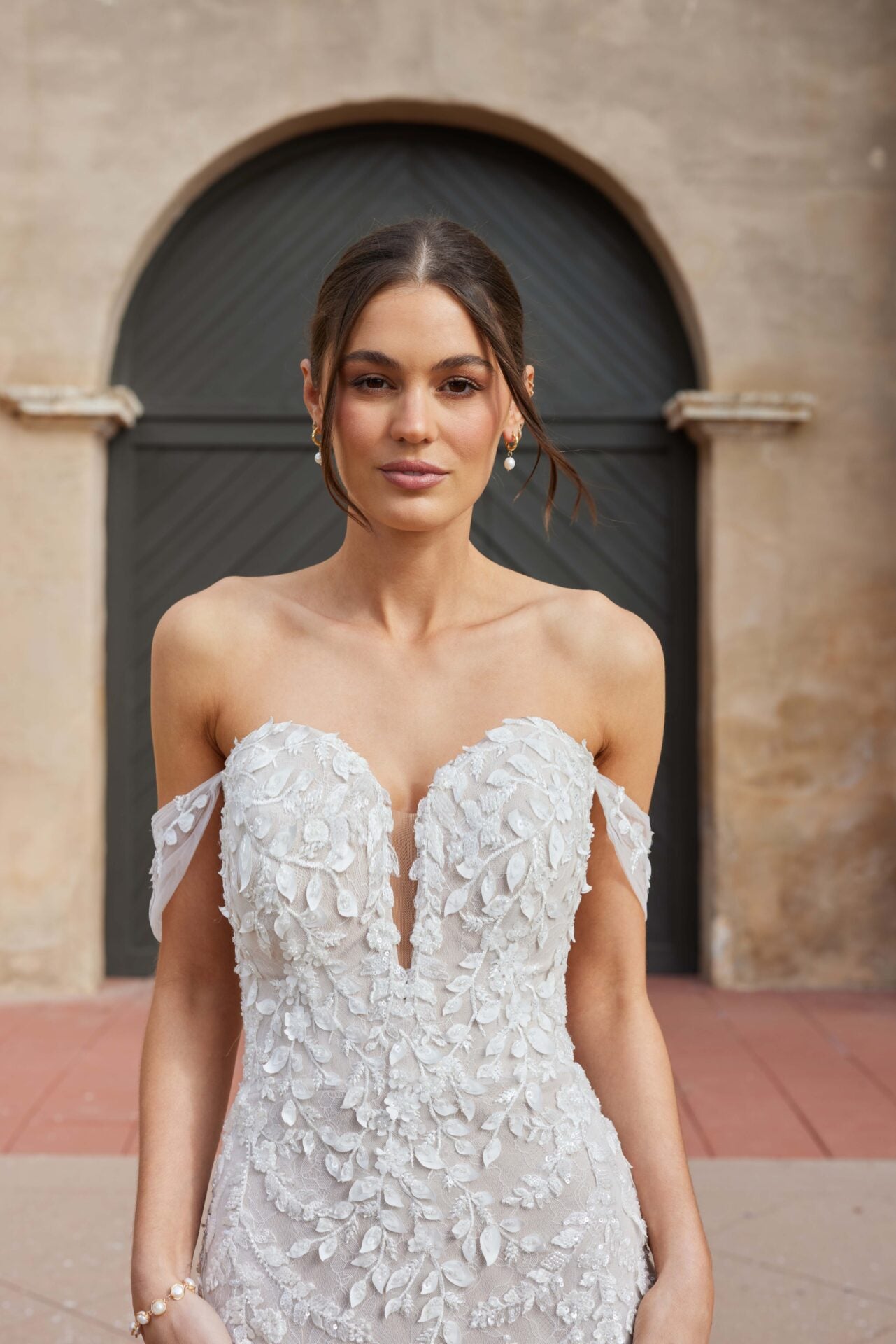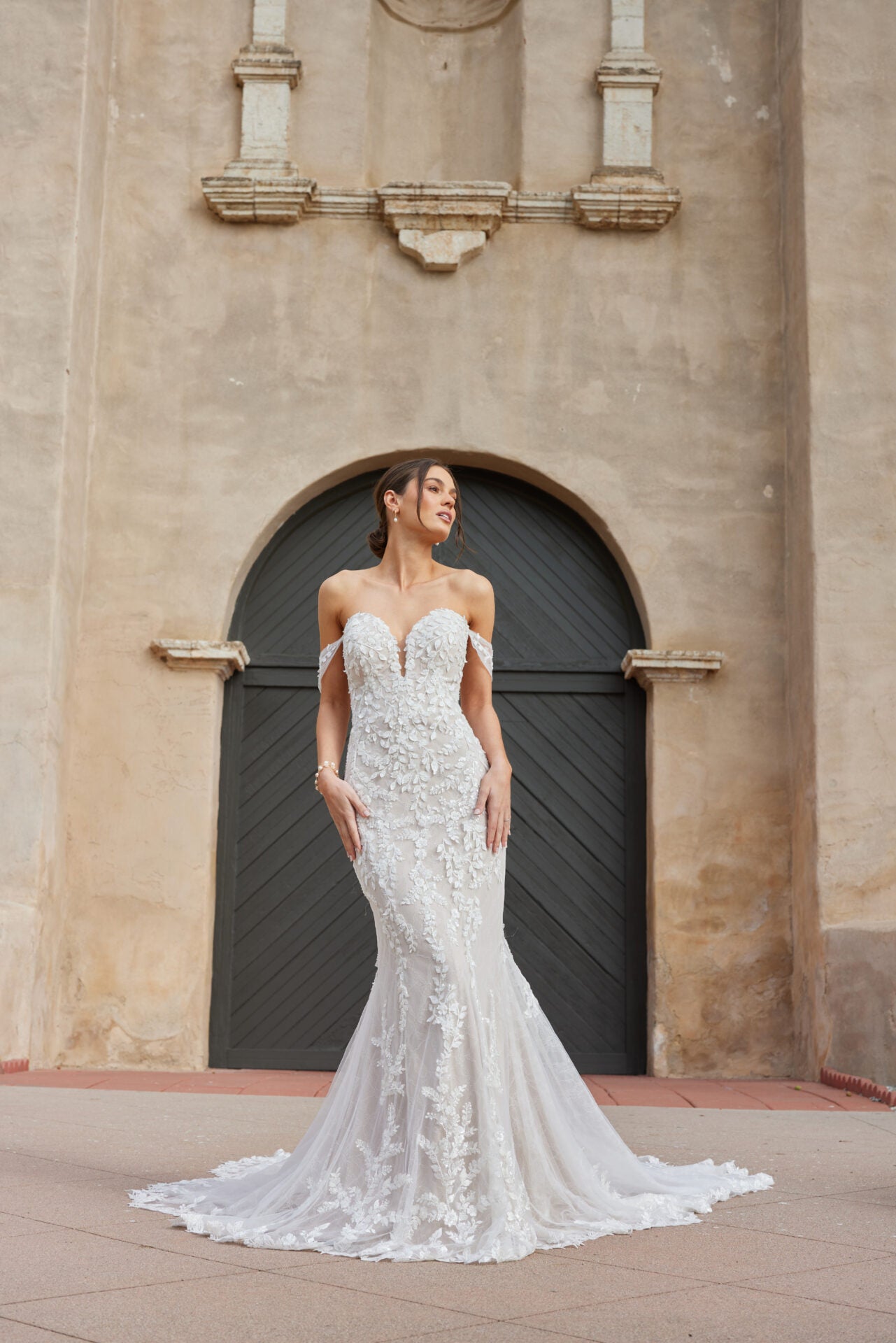 Elegant and romantic, Style D3992 is a sexy fit-and-flare wedding gown with brilliant and unique embellishments. From a strapless plunging sweetheart neckline, detachable lace and tulle off-the-shoulder straps grace the upper arm, adding a soft and alluring detail to the fitted bodice. Impeccably tailored through the torso, the gorgeous lace gown wraps around the figure into a sheer corset back with 3D floral accents and a subtle row of fabric-covered buttons down the spine. Delicately painted in scattered leafy lace appliqus and 3D floral accents, the fit-and-flare silhouette hugs the hips and flares into a soft, sweeping skirt and shaped train edged in the same brilliant lace motifs. This gorgeous gown is also available in plus sizes.
