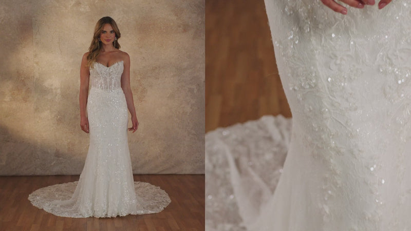 Style D4368 is a dazzling fit-and-flare wedding dress that blends high-fashion detail with timeless romance. Crafted from allover ivory beaded lace layered over soft tulle, this gown features a striking cat-eye neckline that adds modern edge to the classic strapless silhouette. Available in lined or unlined, exposed boning shapes the structured bodice, while 3D floral lace appliqués add texture and complexity across the figure-hugging design. The subtle Basque waist elongates the frame before flaring into a trumpet-style skirt that finishes in a soft, sweeping train. Bold yet refined, this gown is designed to make a memorable entrance from every angle.