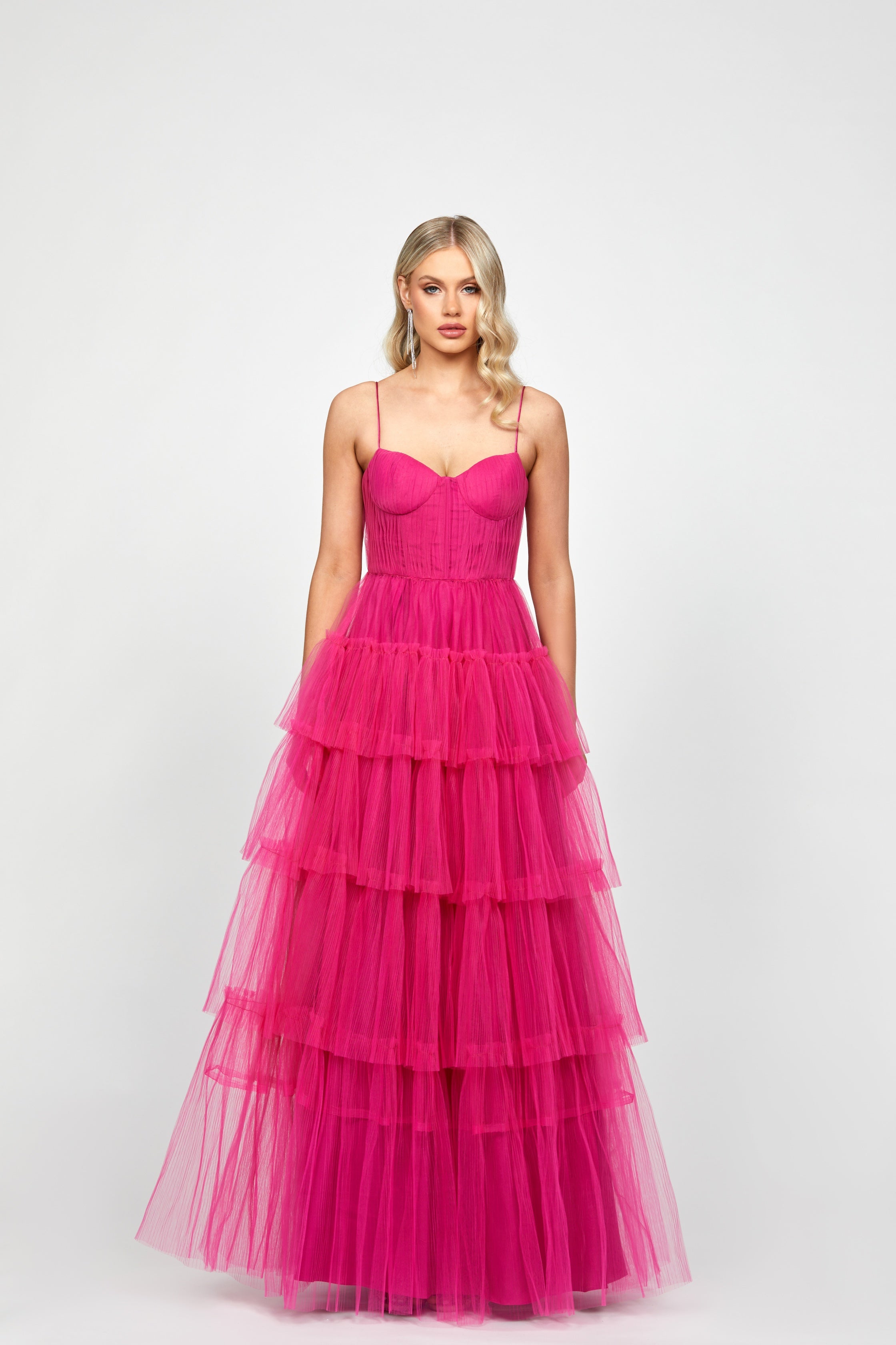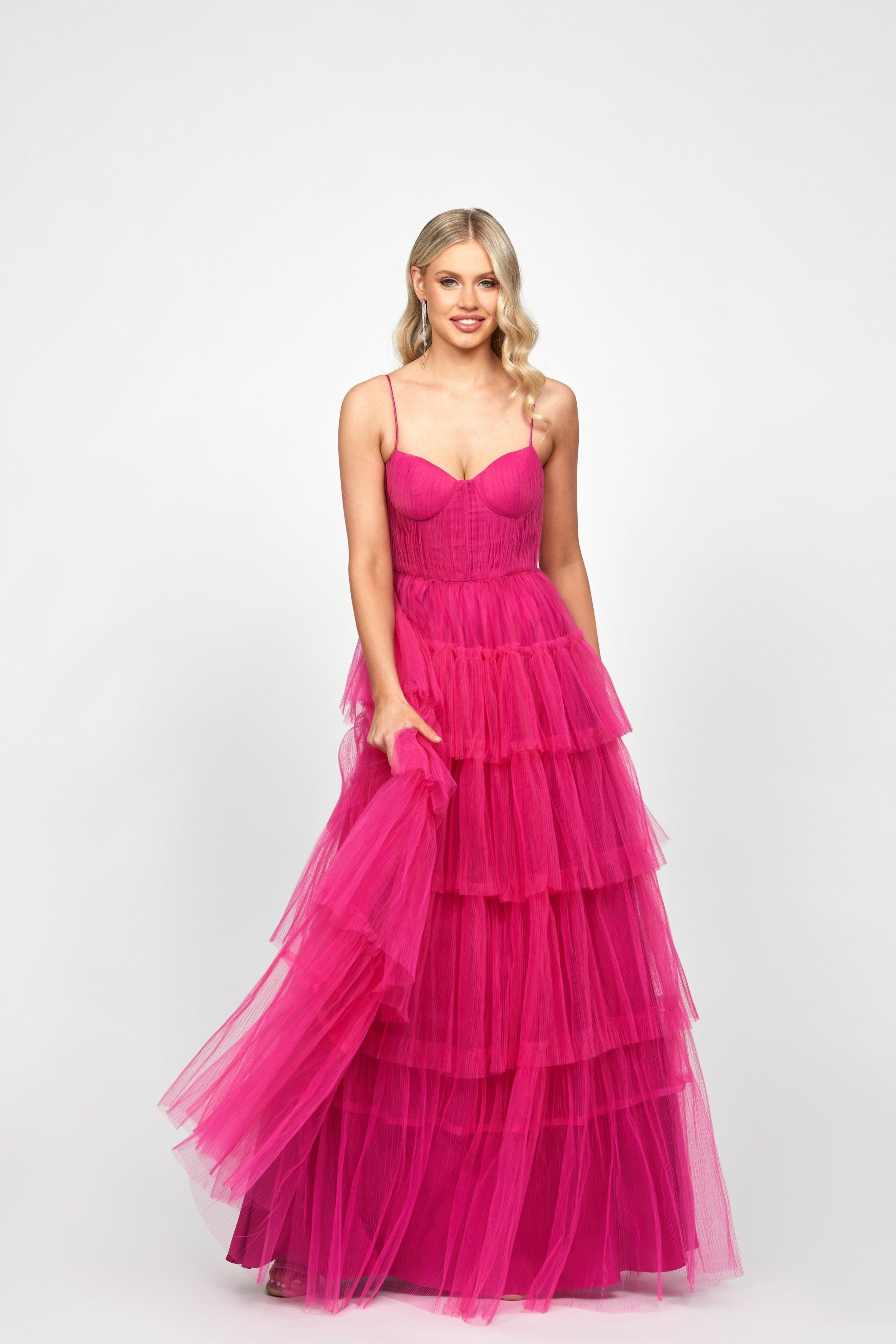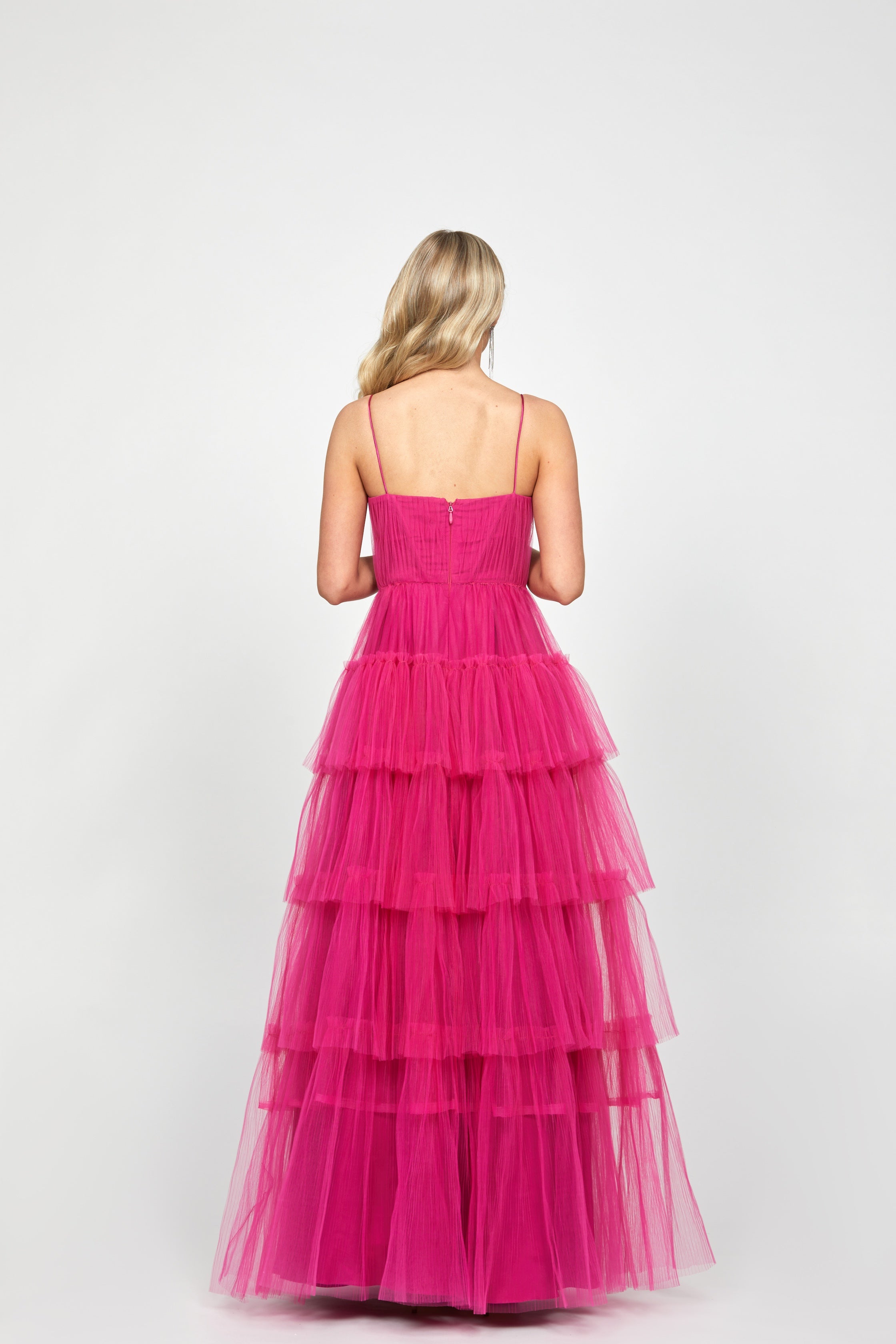 The full-length, multi-tiered A-line skirt is the star of this dress, with its beautiful layers that create a flowing, graceful effect. The stiff mesh interlining adds volume and structure to the skirt, giving it an enchanting, floaty feel with every movement. The invisible back zip closure ensures a seamless finish, while the full lining offers comfort and support for all-day wear.