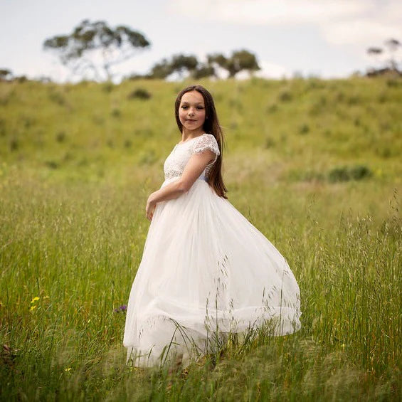 With a beautiful lace fringed V back, soft patterned lace bodice and pretty capped sleeves and a full length tulle skirt this dress will become a fast favourite in your girls wardrobe.