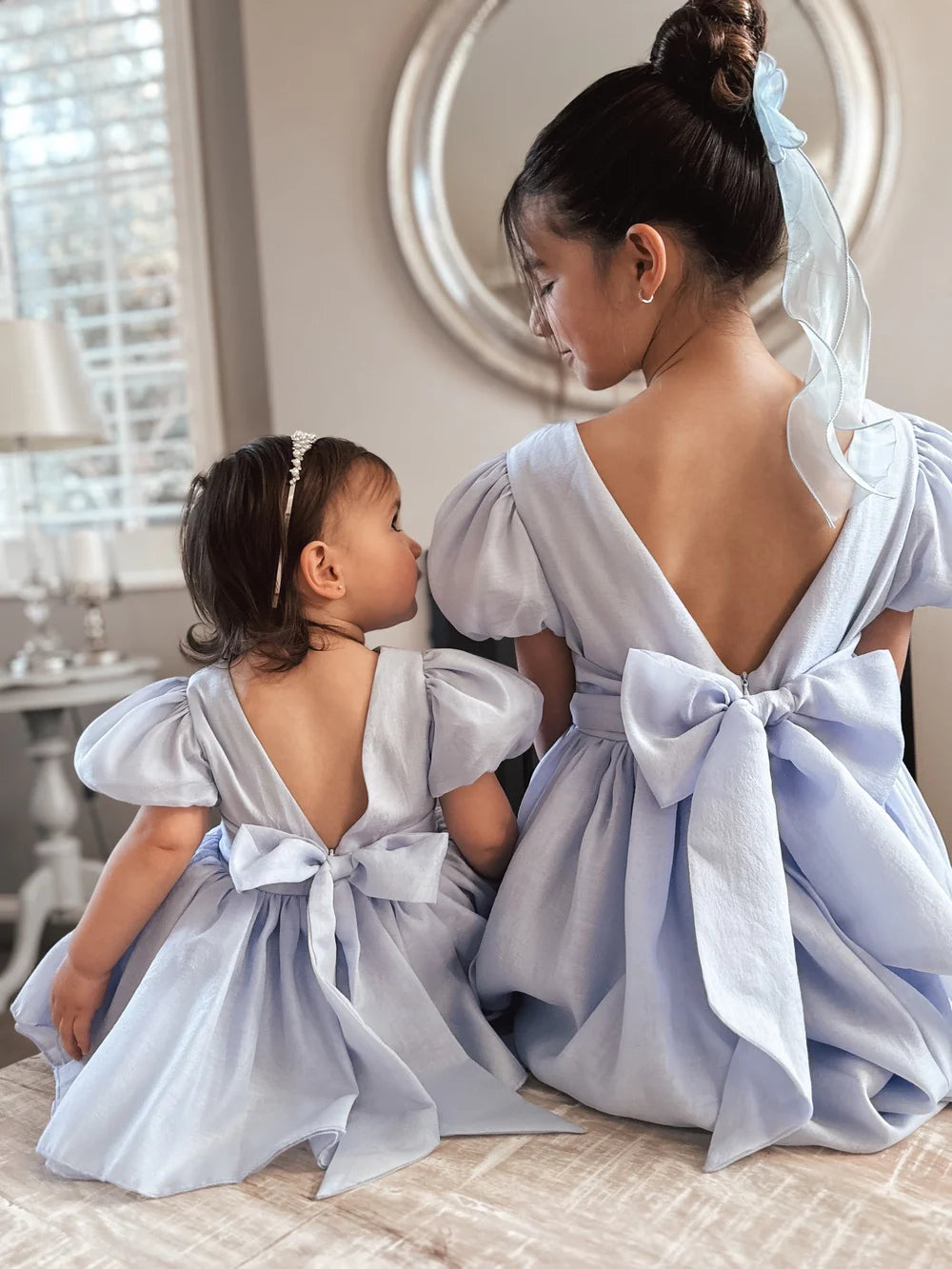 The dress features adorable puffed sleeves and a classic knee-length cut, striking the ideal balance between sophistication and playfulness. The highlight of the Delia dress is its stunning V-back adorned with a large bow that ties gracefully, adding an extra touch of elegance. Comfortable and stylish, this dress is fully lined with 100% cotton for all-day comfort.