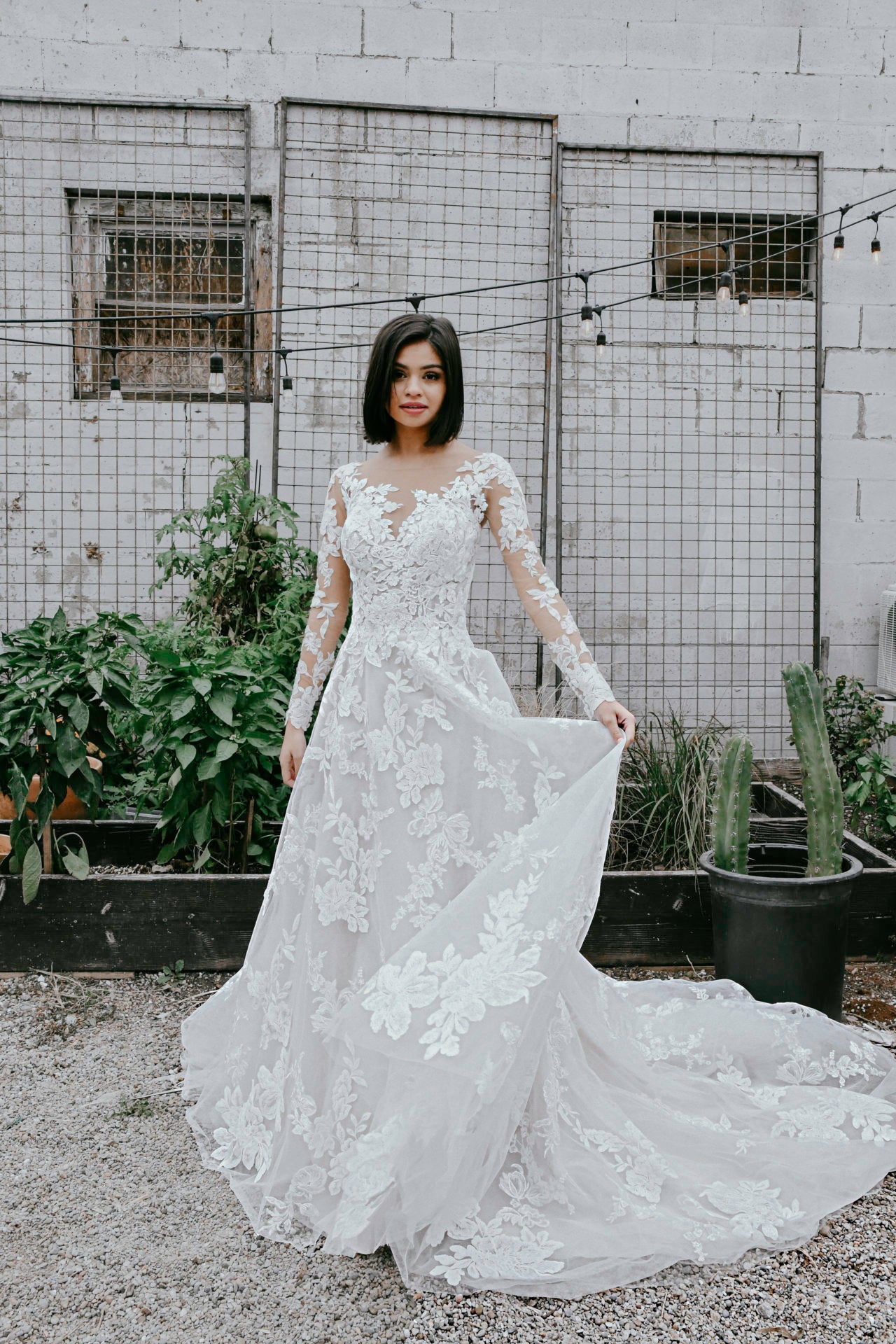 Classic beauty at its finest, Style D3280 from Essense of Australia is your dream come true. Beautiful, traditional floral laces vary in scale and layer in an extraordinary way to create a stunning dimension throughout this elegant silhouette–floating gently over the neckline to create a floating V-shape that carries into the floating V-back. This gown comes with or without the sheer long sleeves, which can take this style from more traditional to marvelously modern (and perfect for summer months)! The unfinished hemline adds to the lightweight feel of this gown, for an effortless glide down the aisle. This gown also comes with an optional glitter tulle layer to bring the drama and glamour to your wedding day. This gown is also available in plus sizes.