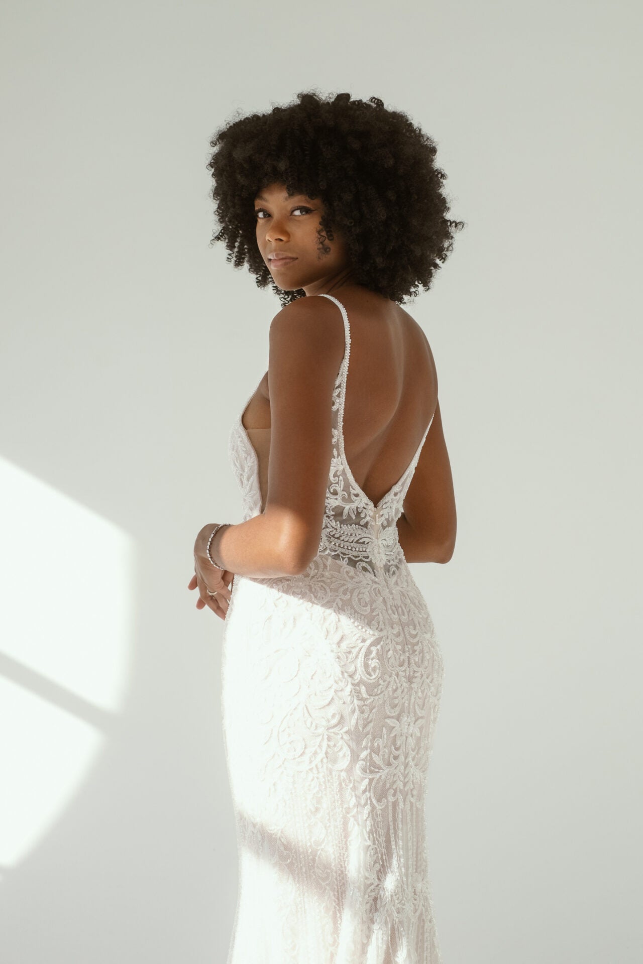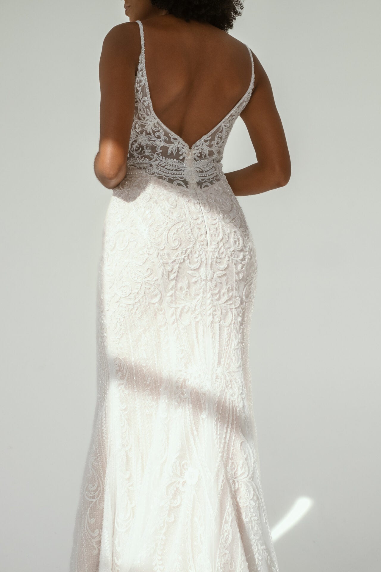 Old-world glamour unfolds in this luxurious art deco style wedding dress. Style D3837 features beaded lace over glittering tulle in a soft and flattering fit-and-flare silhouette. Sleek spaghetti straps grace the shoulder to meet a soft V-neckline accentuated with lace embellishments as sheer side cutouts and a low back detail add a touch of modern design and highlight the scrolling lace features. Fitted past the hips, this sexy slip wedding dress unfolds into a long, shimmering shaped train that magically glides down the aisle.