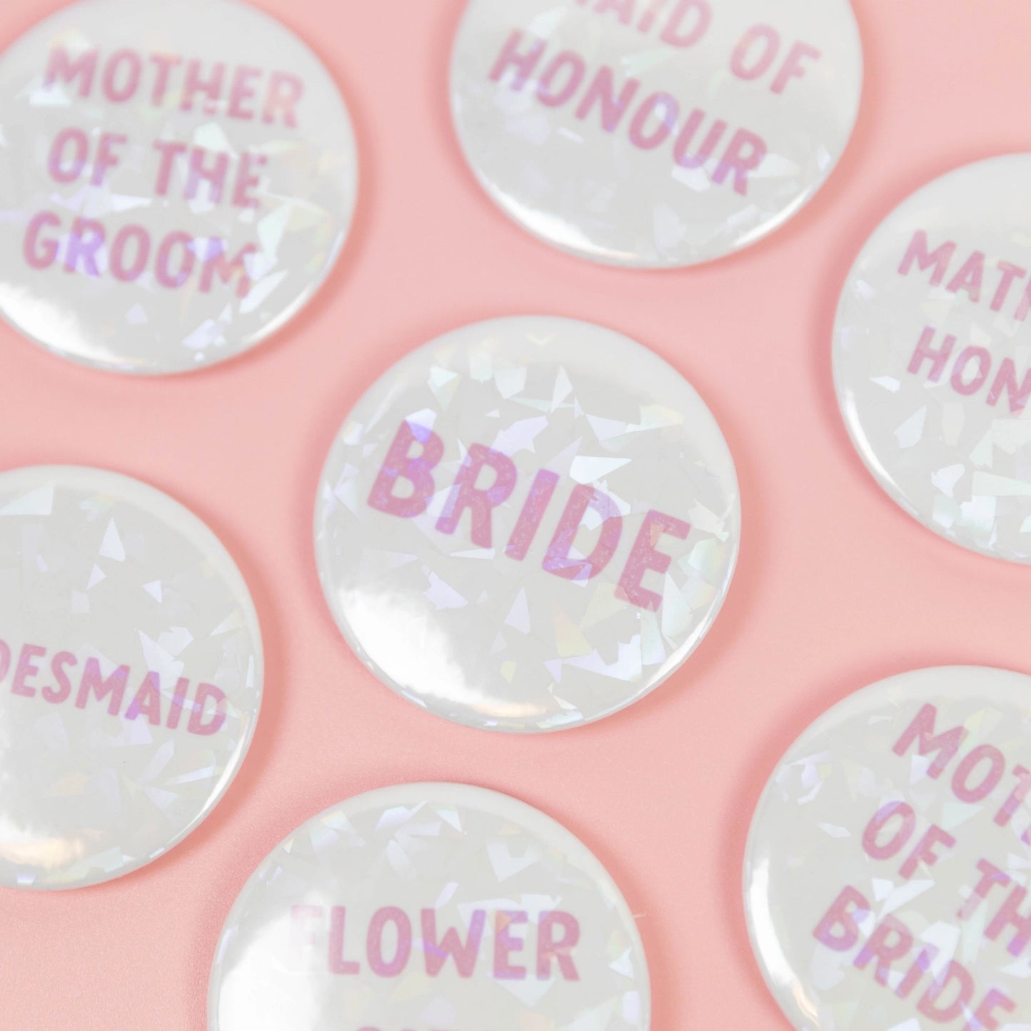 Introducing our Pink Holographic Bride Badge, a stunning accessory for any bride-to-be. This button badge has a holographic finish and is perfect for adding some sparkle to a wedding outfit, or bachelorette party. It also makes for a great keepsake after the celebrations!