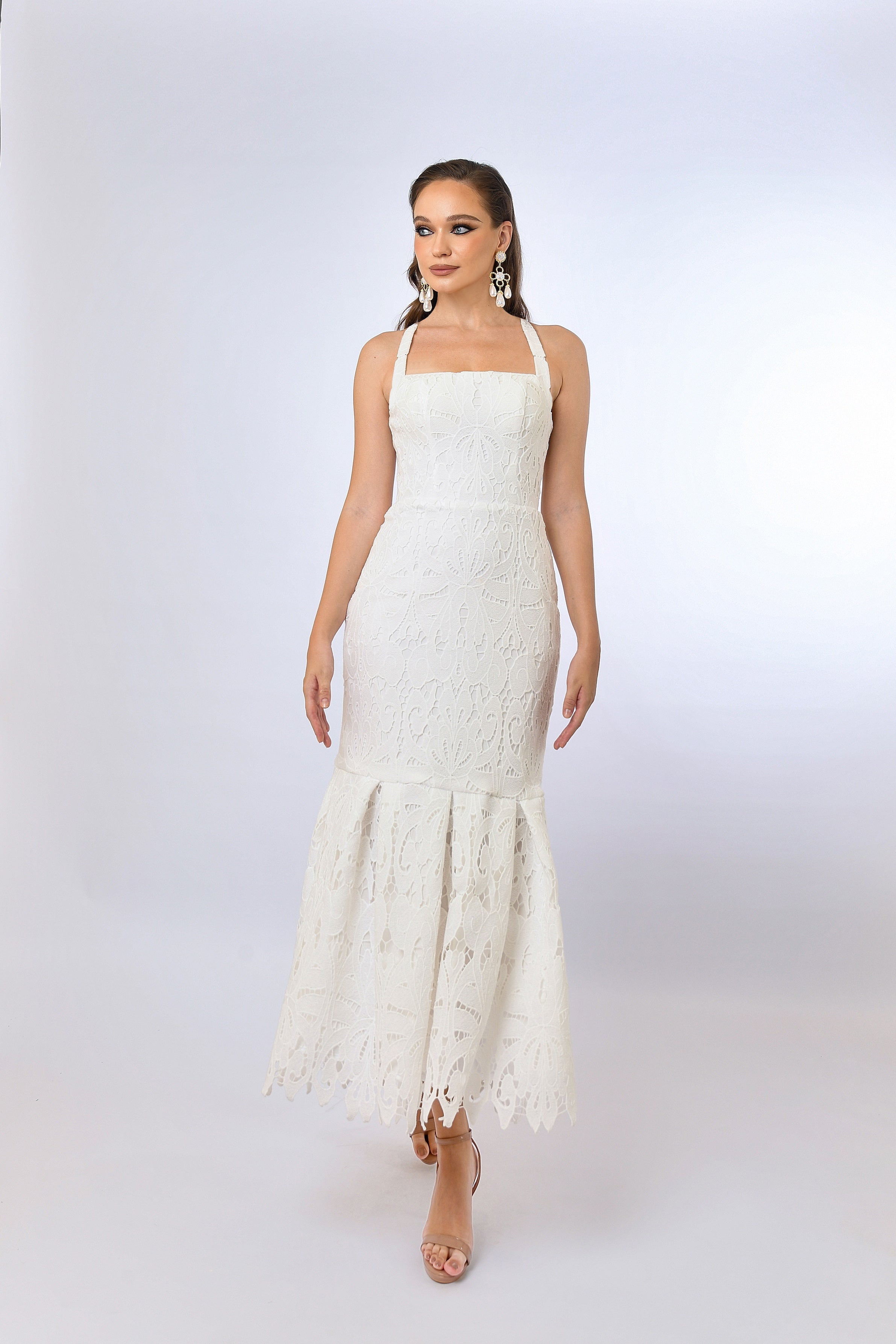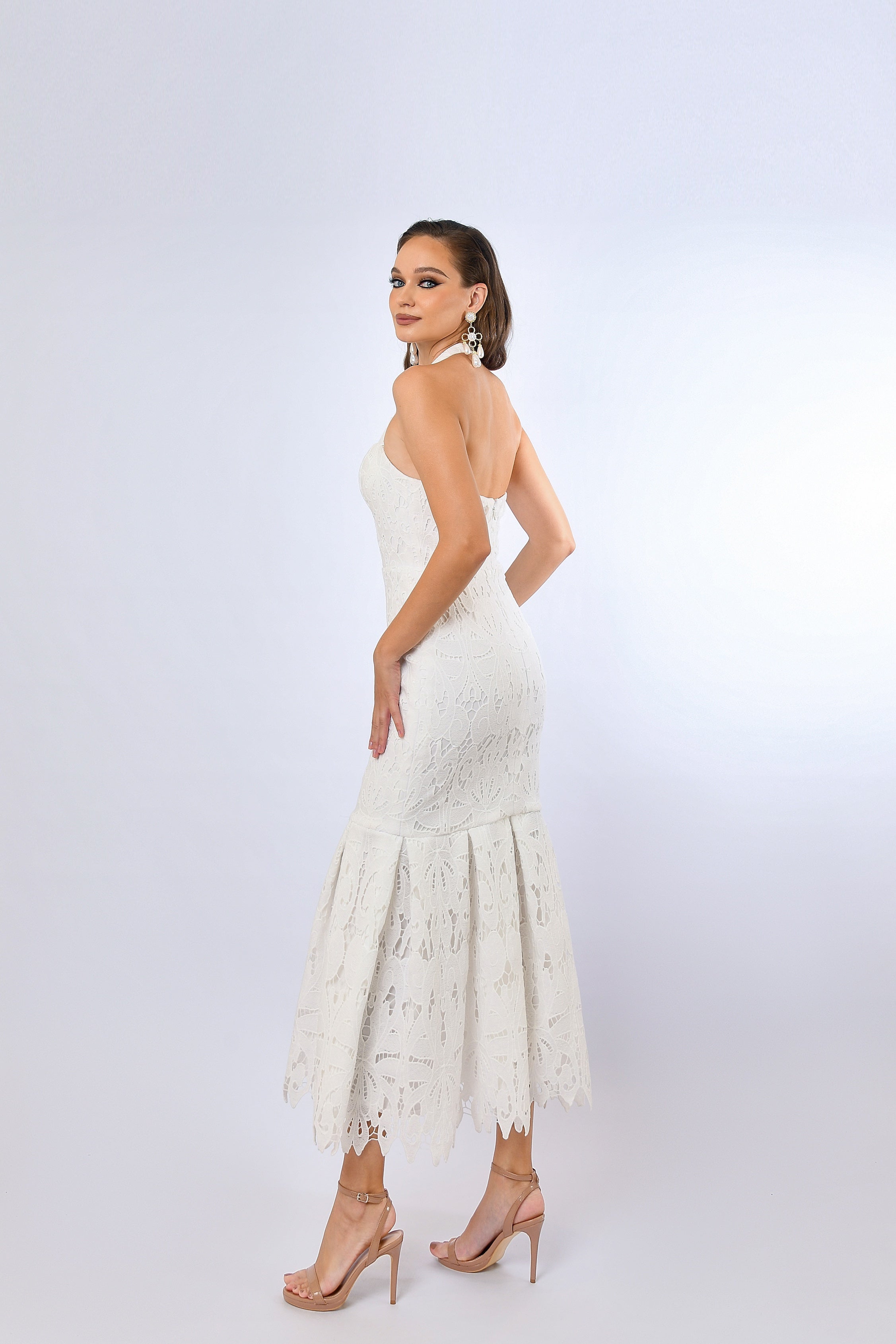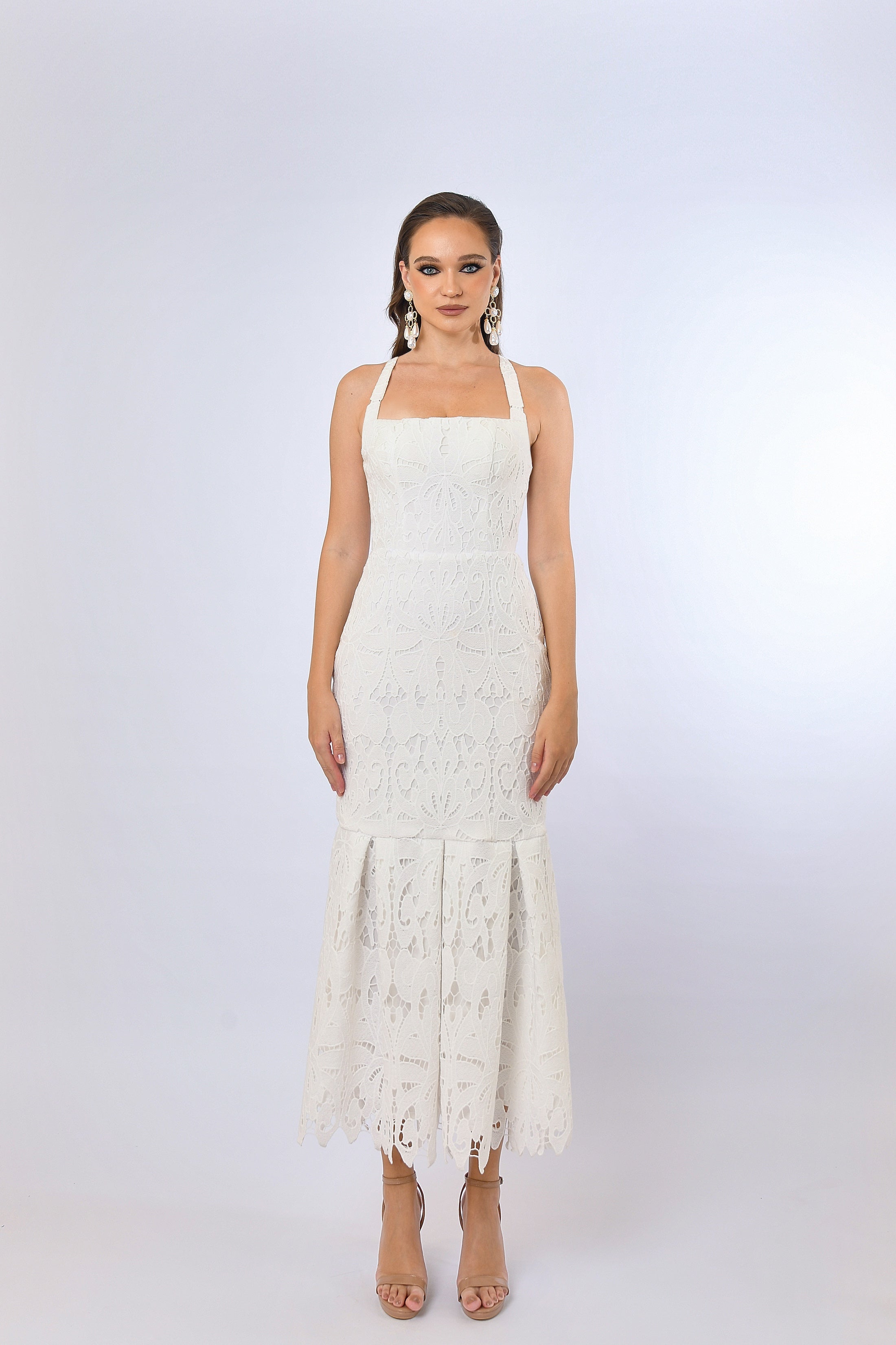 Fun and playful, this dress features a halter neckline with a quirky thick strap detail, built-in cups and a structured bodice. The midaxi length skirt is adorned with a pleated mermaid flounce and a charming scalloped hem. Plus, with full lining and an invisible back zip closure, it's perfect for a summer engagement party, hens party, or as a reception dress.