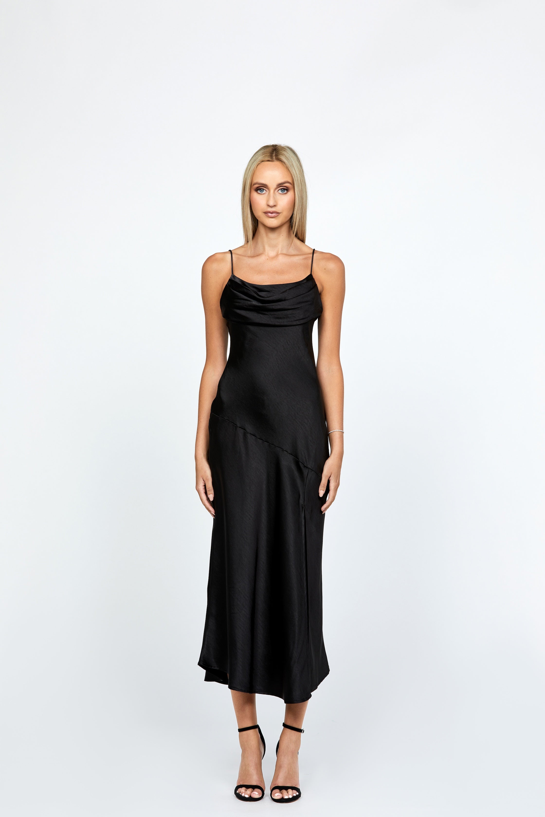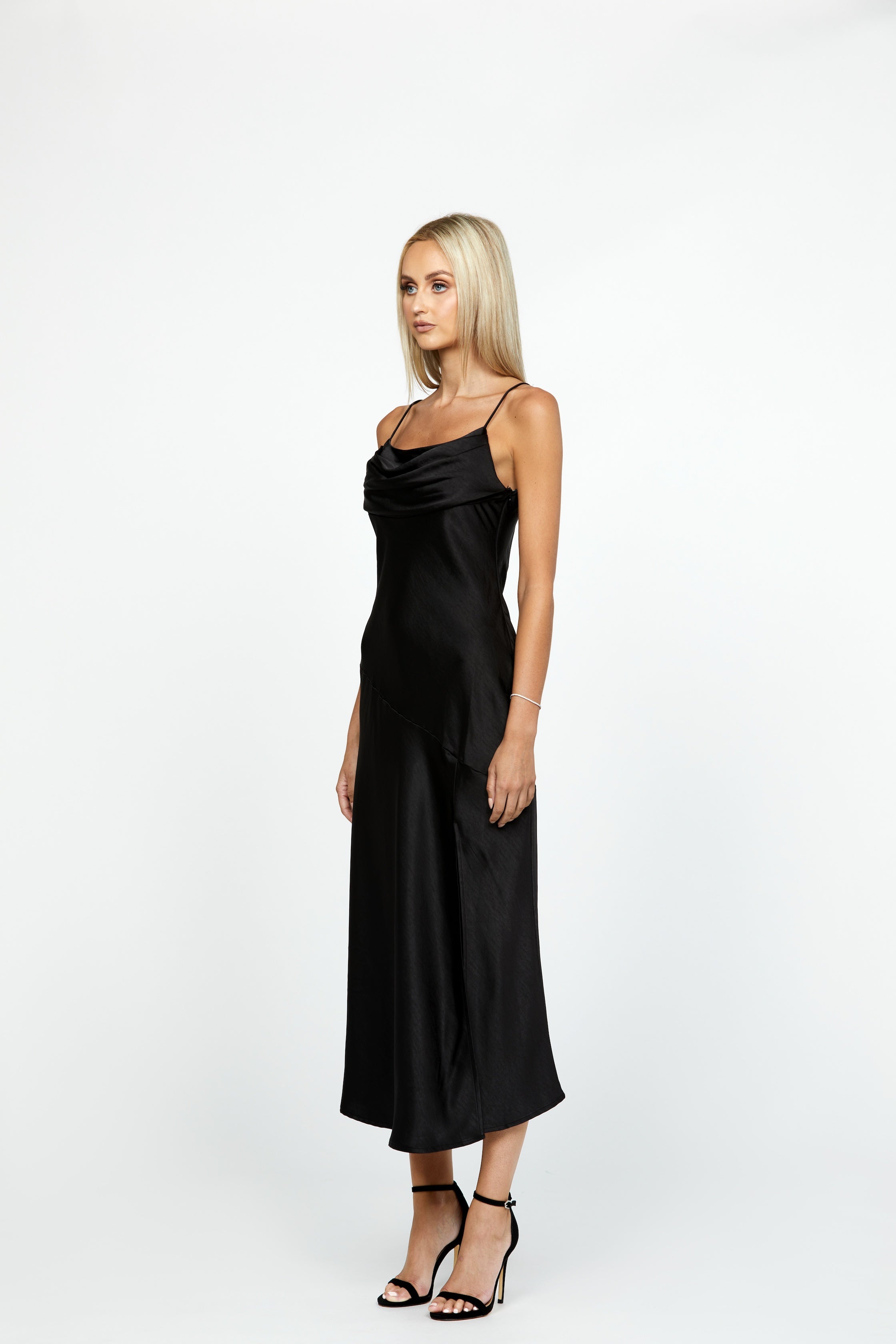 Cowl that neckline and spaghetti strap in a bias cut skirt, with an invisible side zip and a non-stretch drape satin lining. Flattering and flirty, this dress will have you feeling like a goddess (with no uncomfortable squeezing from stretchy materials)! The bias cut skirt provides a sleek and elegant silhouette, while the cowl neck and spaghetti strap add a touch of allure. And with the convenient side zip and luxurious satin lining, this dress is as easy to put on as it is to wear all day (or all night) long.