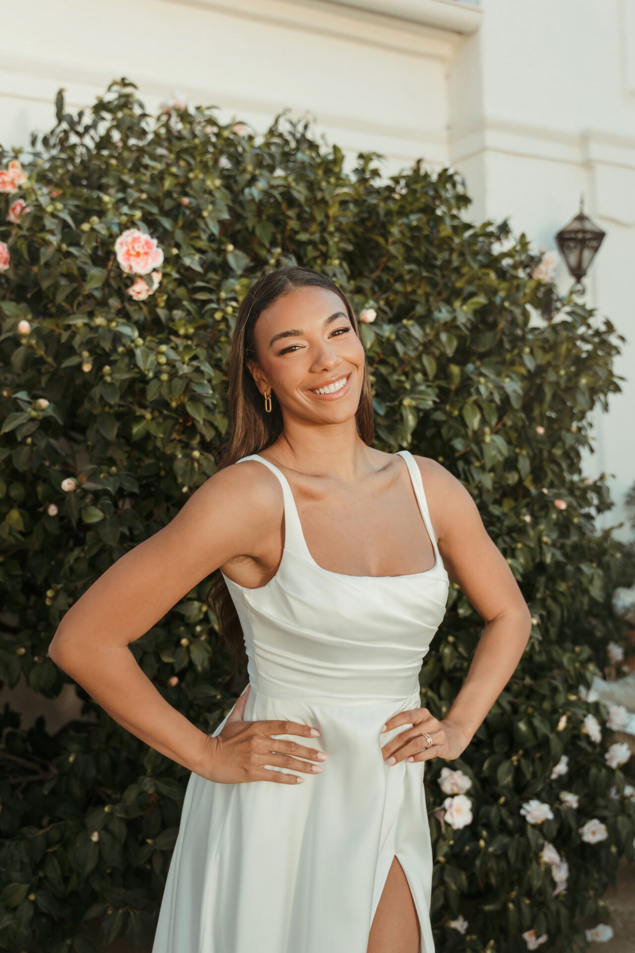 Sleek and sophisticated, Style SY8110 redefines modern bridal elegance with a fashion-forward edge. Chic shoulder straps frame a refined square neckline, complementing the dreamy ruched bodice for a clean, minimalist look in luxurious satin. At the back, a softly scooped detail enhances the gown's effortless allure, leading to a row of fabric-covered buttons that trail down the length of the skirt. A tasteful, optional high leg slit adds a contemporary touch, bringing movement to the modern A-line silhouette. Designed for the bride who embraces minimalist glamour with a hint of drama. This gown is also available in plus sizes.