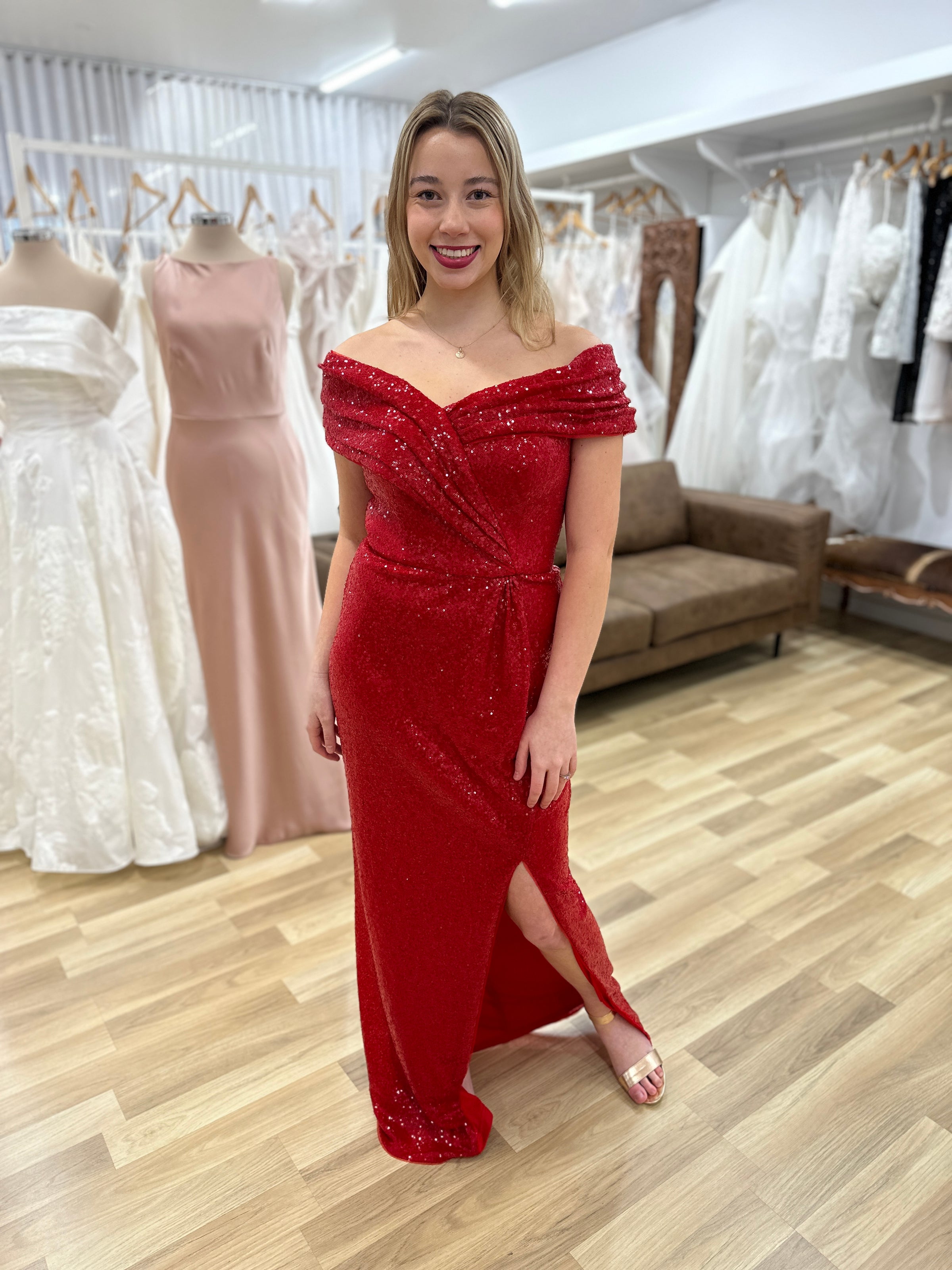 Evanie Draped Off Shoulder Sequin Gown