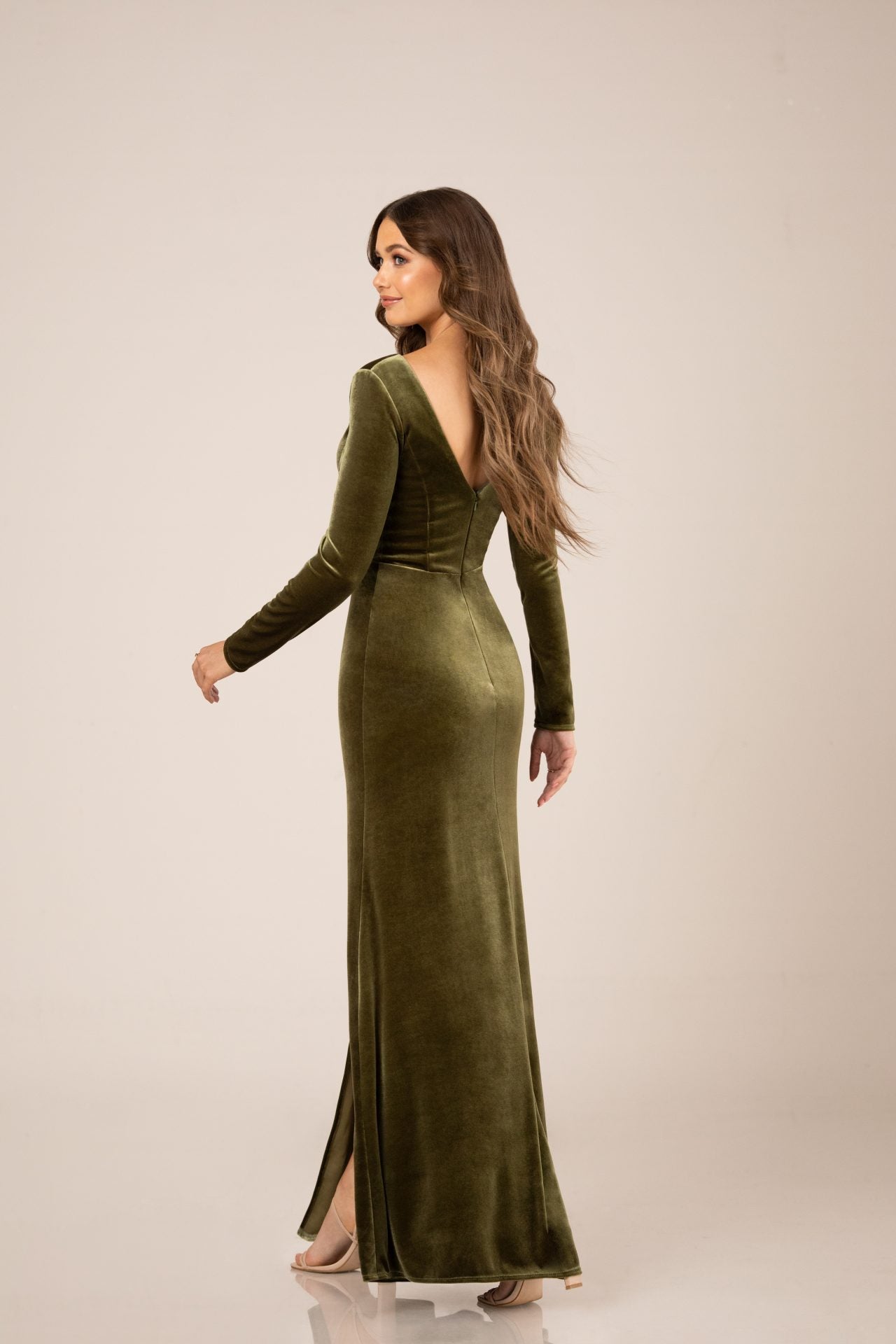 LONG SLEEVE VELVET BRIDESMAID DRESS WITH V-NECKLINE AND THIGH SLIT