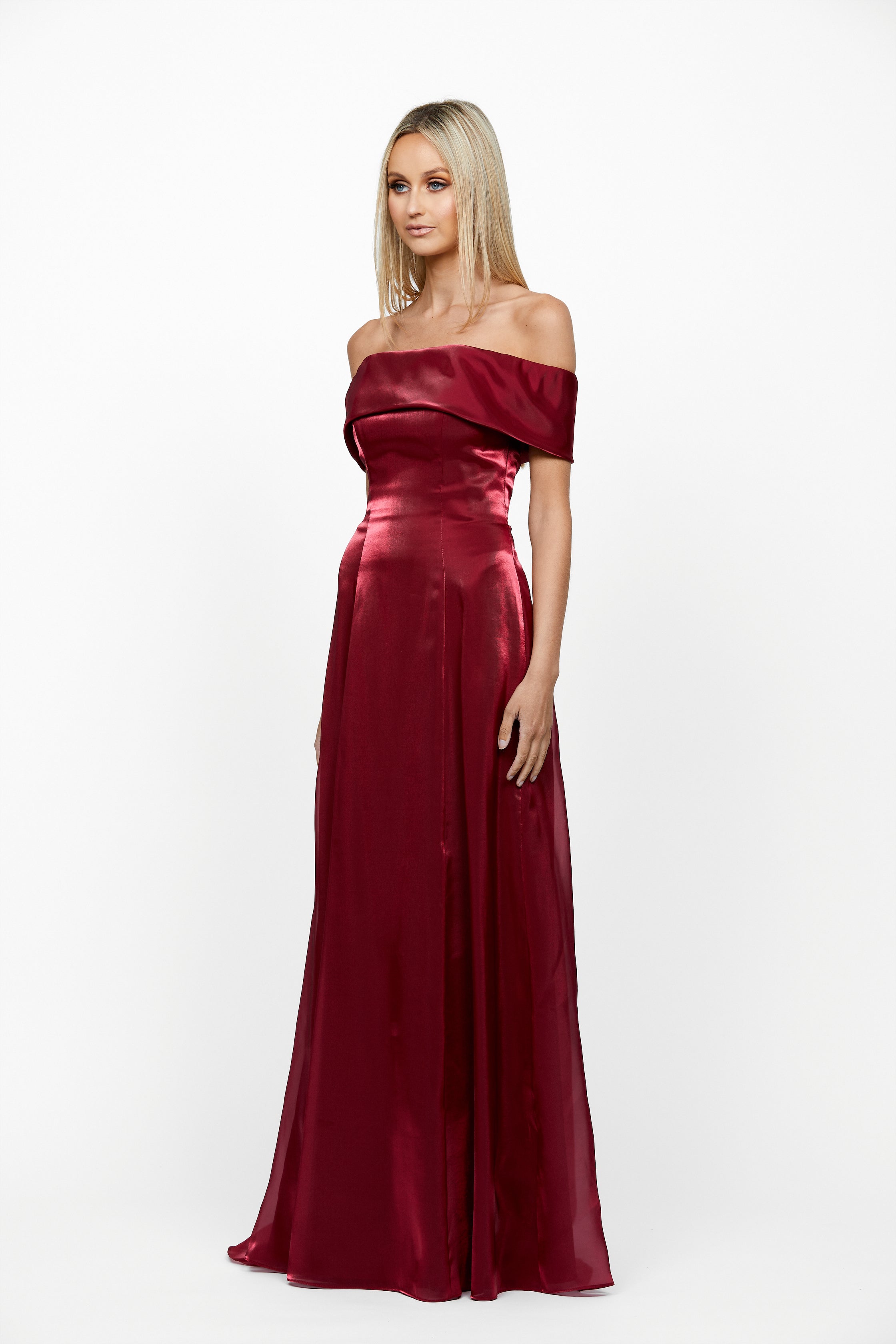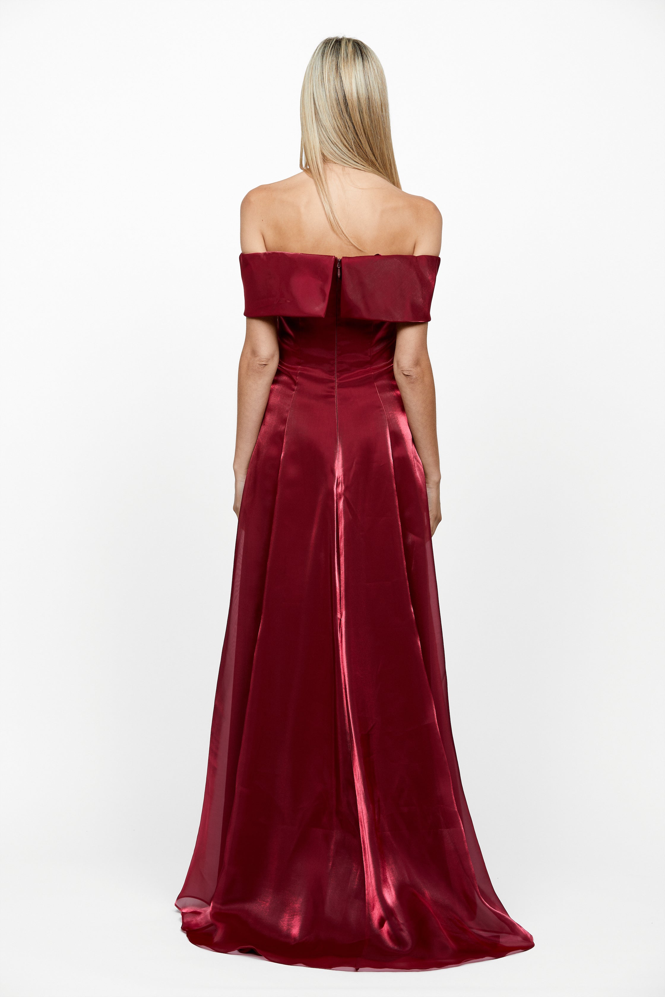 Constructed from luxurious sheen organza, this evening gown features a fashionable off shoulder neckline and an A-line full skirt with a train - perfect for school formals or special evenings. The perfect mix of luxury and style - ensuring you'll look like the belle of the ball wherever you go!