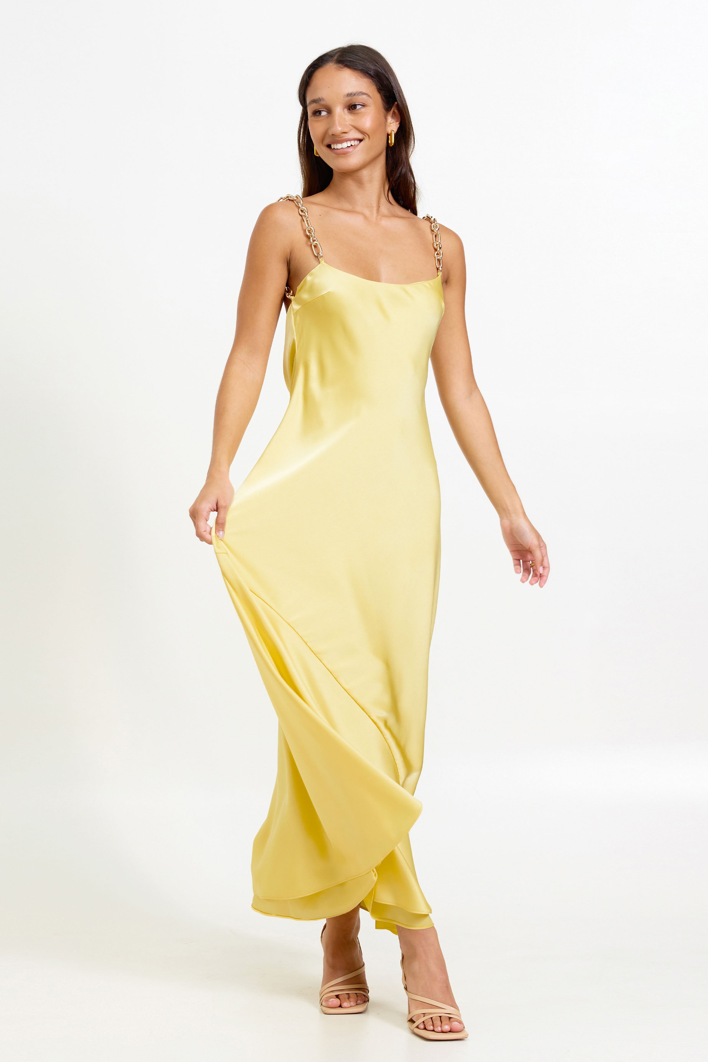 The Lisandra Dress is cut from a luxe satin and showcases a beautiful deep cowl back. The slightly scooped neckline is perfectly paired with an interchangeable statement gold chain. The soft A line silhouette perfectly skims the hips and finishes at the ankles.