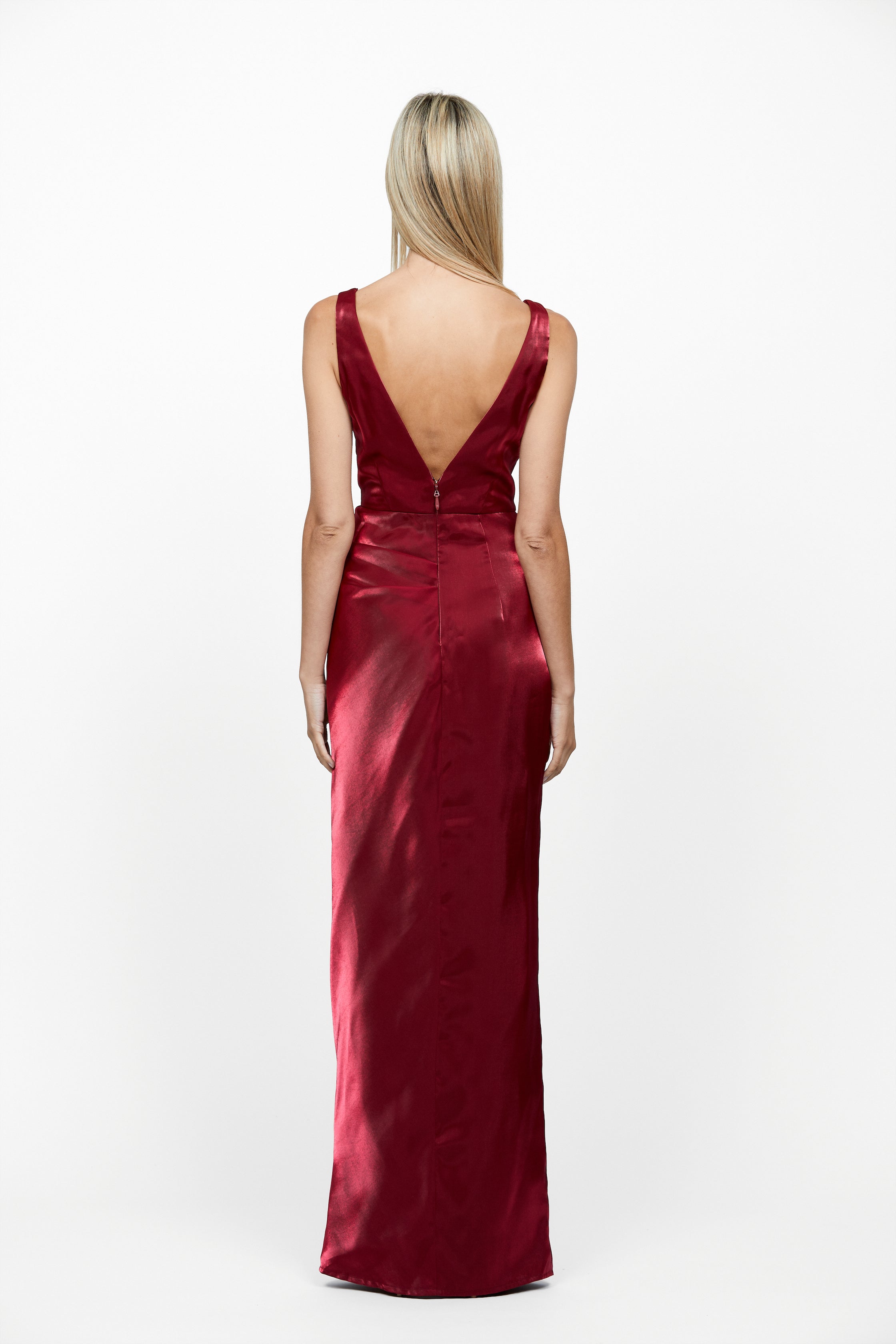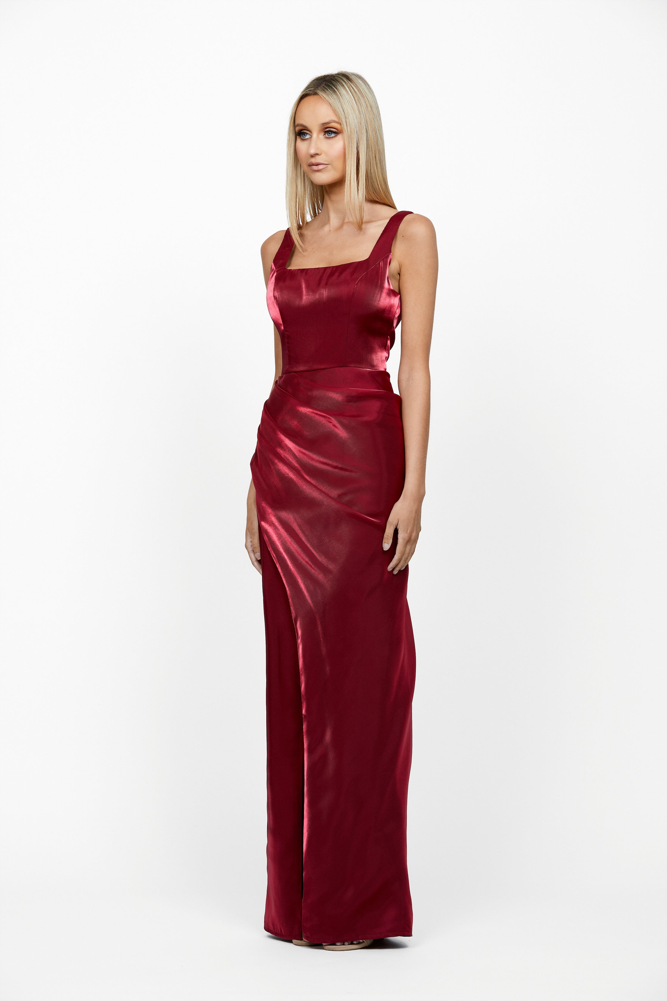 A squared neckline and thick straps give this Minka Gown a structured, confident look. Finished with a wrap skirt featuring subtle tucks on the front and a leg split opening, this dress is crafted from a luxurious sheen organza fabric. The perfect combination of timeless elegance and contemporary chic. Wear it anytime you want to make a statement!