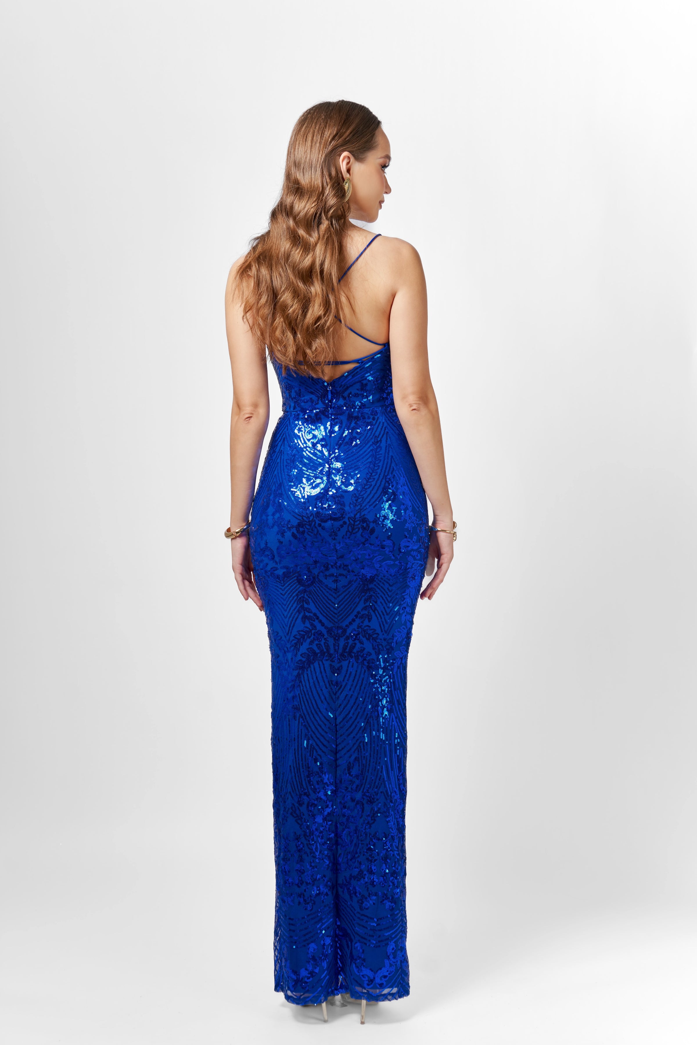 Show off your unique sense of style with this stunning gown that features a scoop neckline, spaghetti straps, and a playful tie-up back. The boned bodice and built-in cups provide both support and comfort, while the front side split adds a touch of elegance. And with a full-length column skirt and invisible back zip closure, you'll be ready to dance the night away. Plus, the classic sequin print adds just the right amount of flair. This gown is a must-have for any school leaver looking to make a statement.