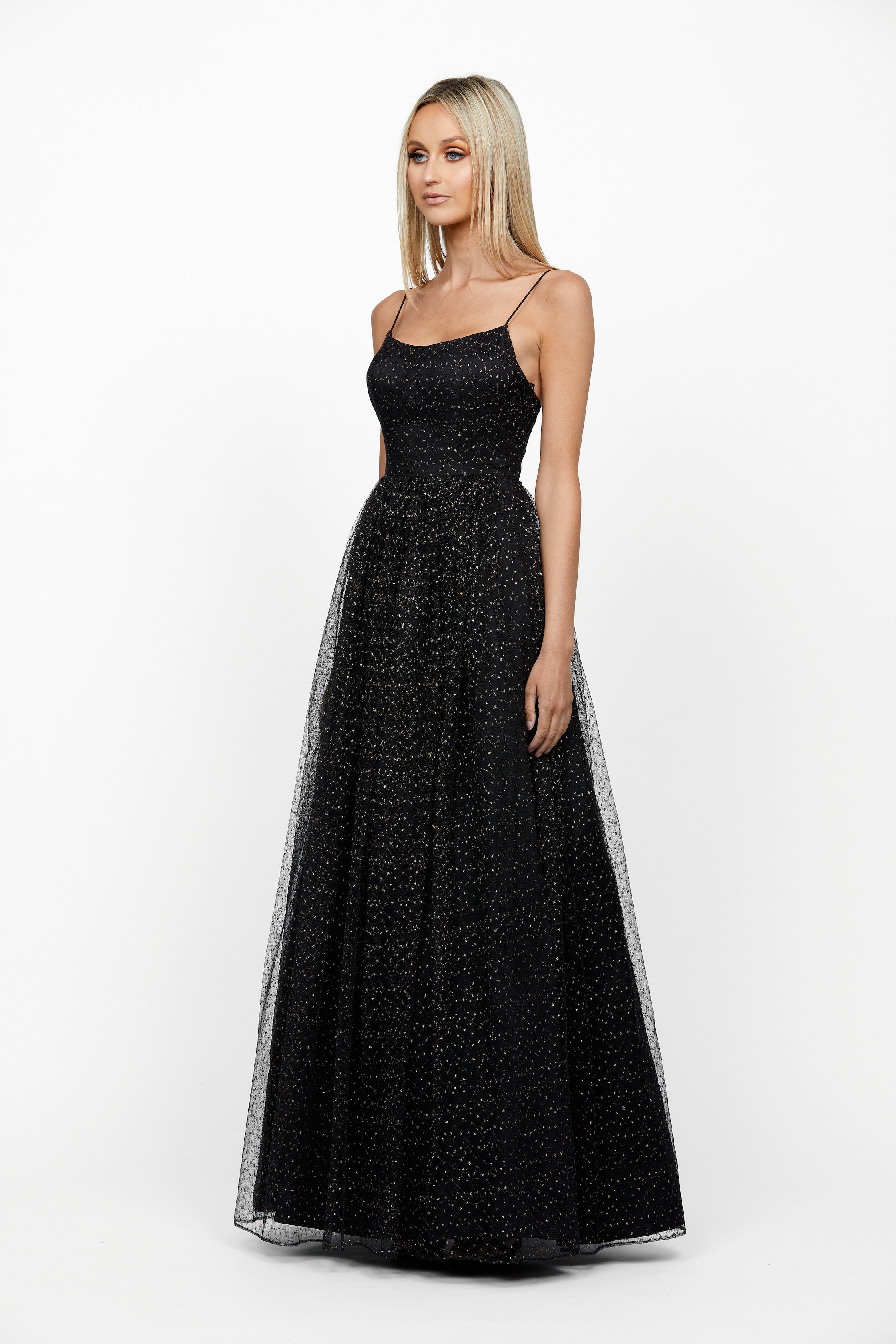 This Sorrento Scoop Neck Ball Gown features a luxurious Lurex lace scoop neckline, complete with thin spaghetti straps. Further, it boasts a full A-line skirt, perfect for an eye-catching shimmering addition to special occasions.