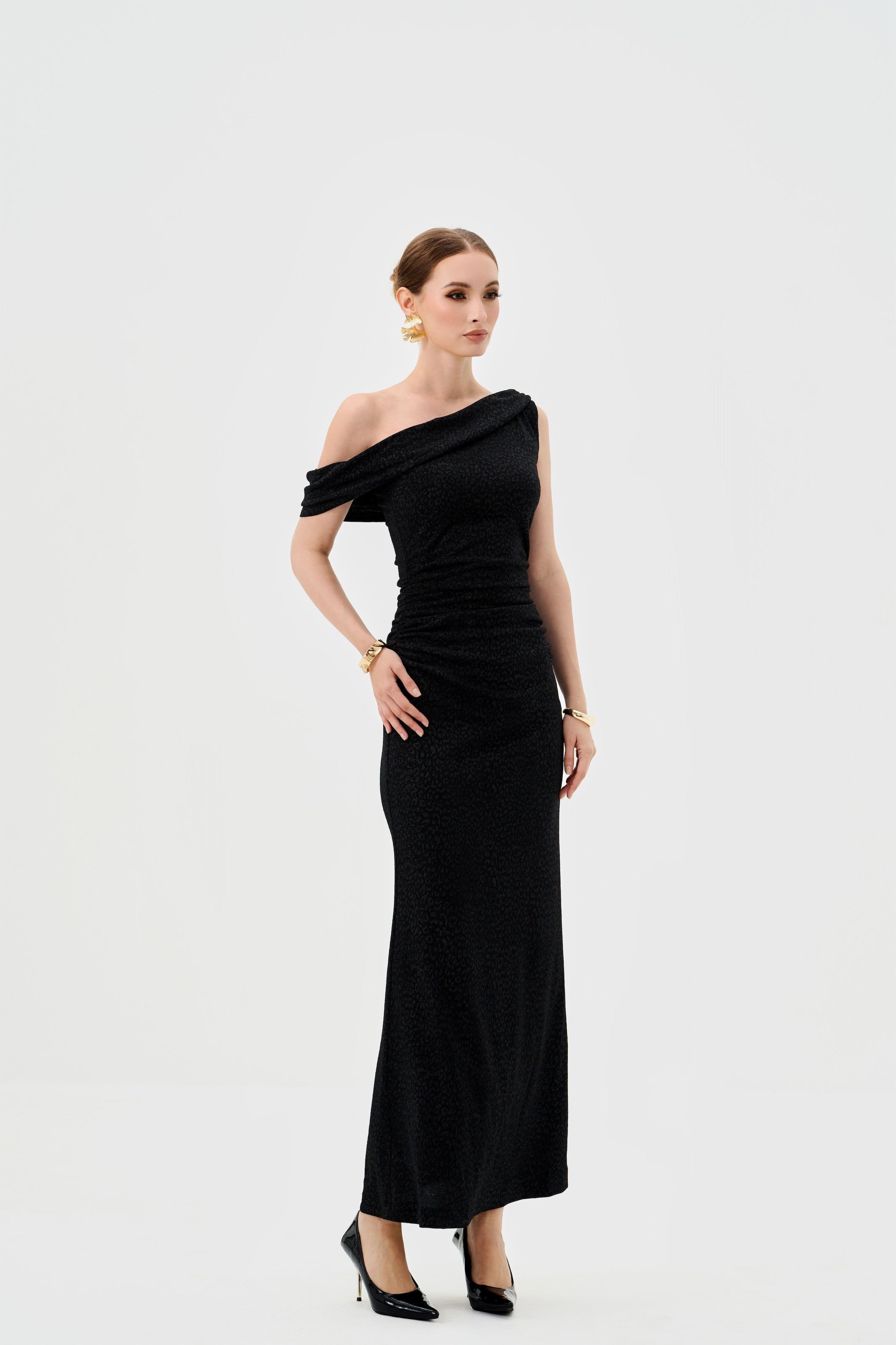 Slip into effortless elegance with this show-stopping maxi. The asymmetric one-shoulder design and ruched bodice create instant drama, while the fitted silhouette with strategic gathering keeps things flattering. Metallic jersey catches the light beautifully, and the midaxi length with a subtle flare at the hem strikes the perfect balance between sophisticated and fun. Fully lined with a hidden back zip for a seamless finish. Whether you're heading to a semi-formal soirée or a black-tie affair, this versatile piece is the dress that does it all—and looks absolutely stunning doing it.
