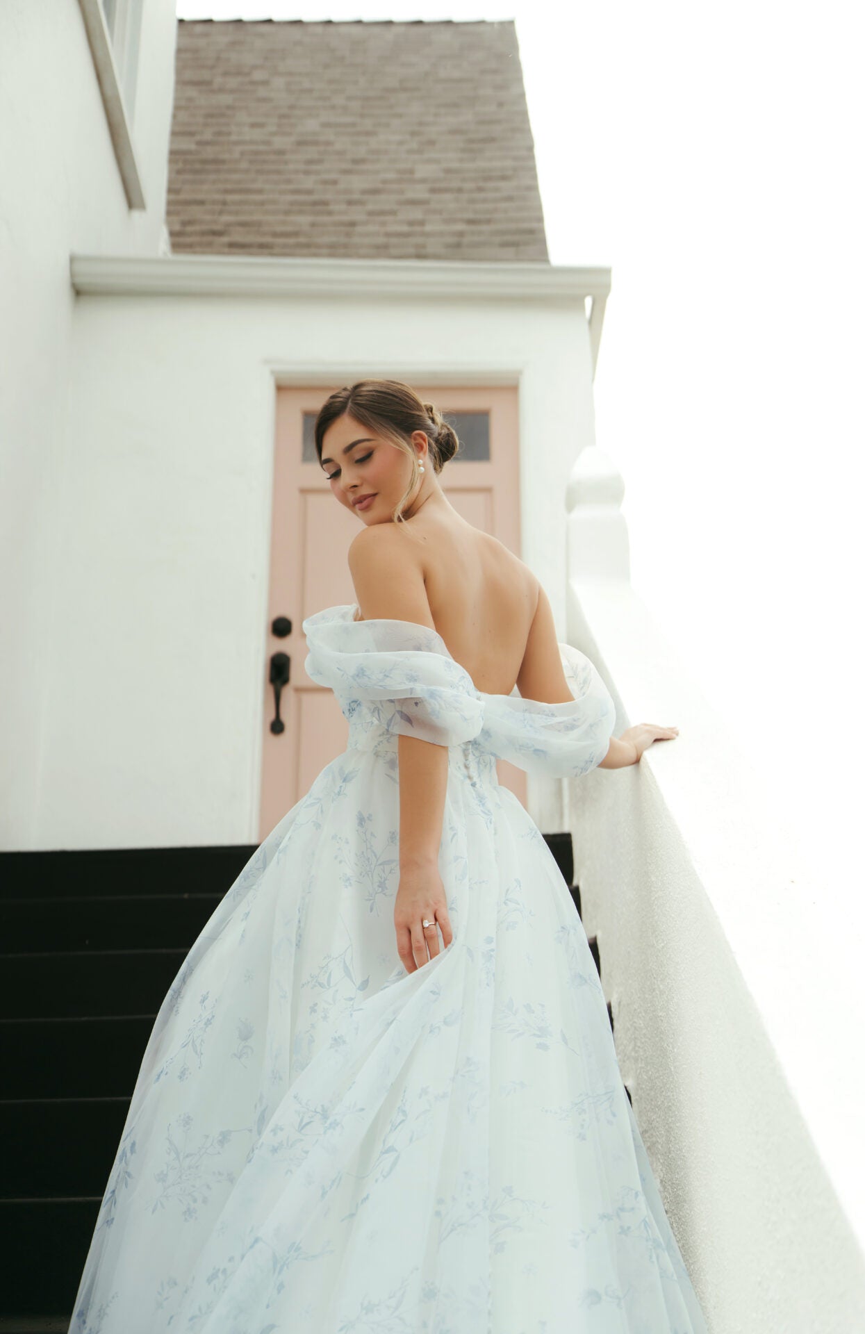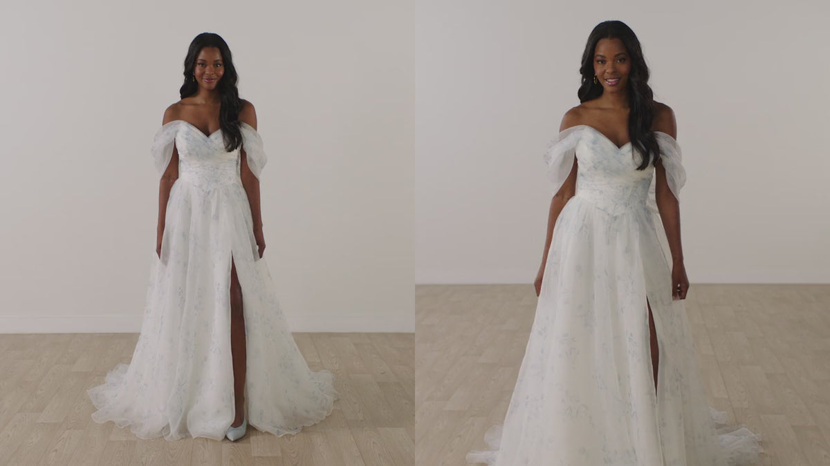 Style SY8215 in French Blue reimagines bridal romance with a fresh and vibrant twist. Crafted in soft organza adorned with subtle blue floral prints, this A-line wedding dress features and elegant basque waistline that beautifully accentuates the figure. Off-the-shoulder straps lead to a romantic sweetheart neckline, framing the bodice with timeless charm. Layers of lightweight chiffon gently wrap and flow from the waist, while a high leg slit adds a modern touch and effortless movement. For the bride seeking a unique blend of classic elegance and contemporary flair. This gown is also available in plus sizes.