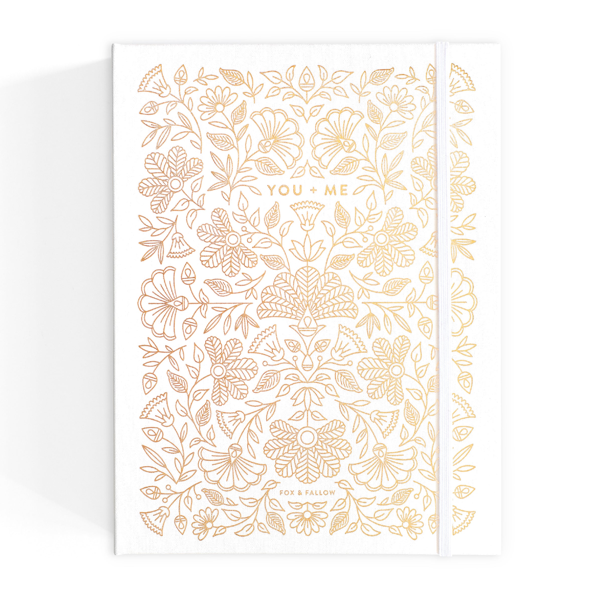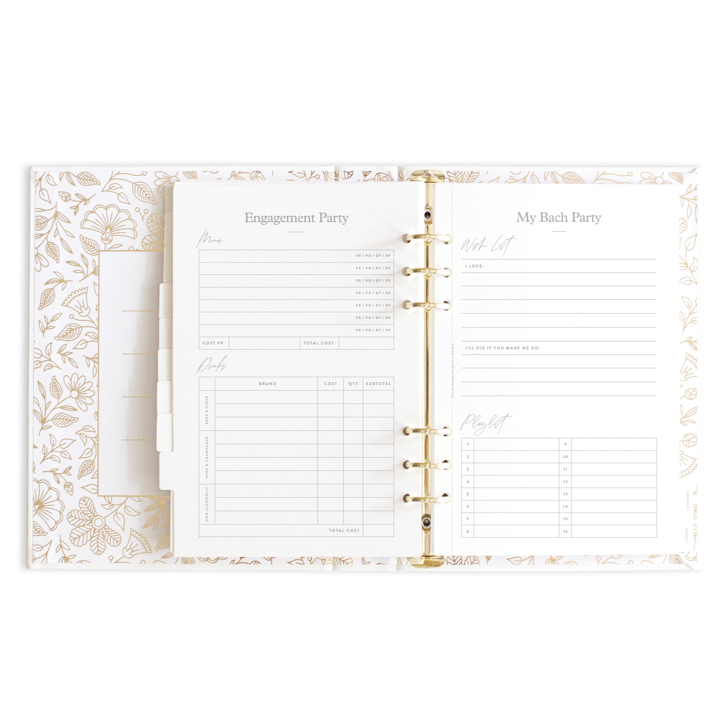 Gold foil stamped white waterproof linen hard cover, designed to last through many months of planning. White elastic and gold ring binder. Foiled tabbed divider pages. Handy document pockets at the front and back for business cards & flyers. 6.9 x 9" (1.4" spine) / 175 x 230mm (35mm spine). Foiled end pages and premium 90gsm FSC-certified paper. Packaged in a cello sleeve with gold foil bellyband. Designed in Australia, printed in China.