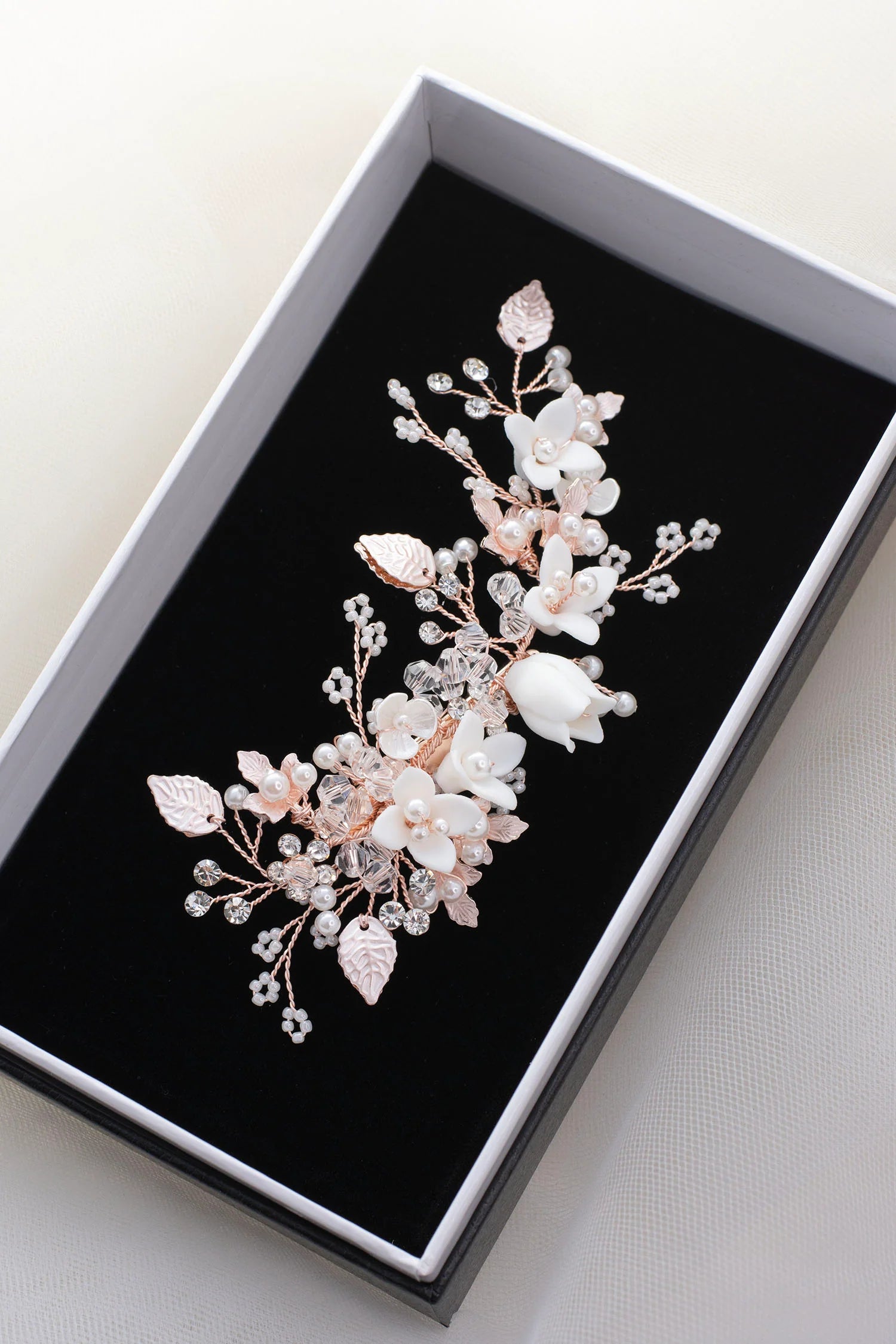 Put your best bridal foot forward with the Harlow Clip, a most delicate porcelain wonder. With all the intricacies of a growing vine and the softness of a petal, let Harlow grow along the back of the head. With feather-like qualities, Harlow gently weaves itself with elegance and glamour. Fitted with a strong clip at the back, Harlow is easy to rest over the top of a veil and wear all night long. Let Harlow shine with you on your special day.