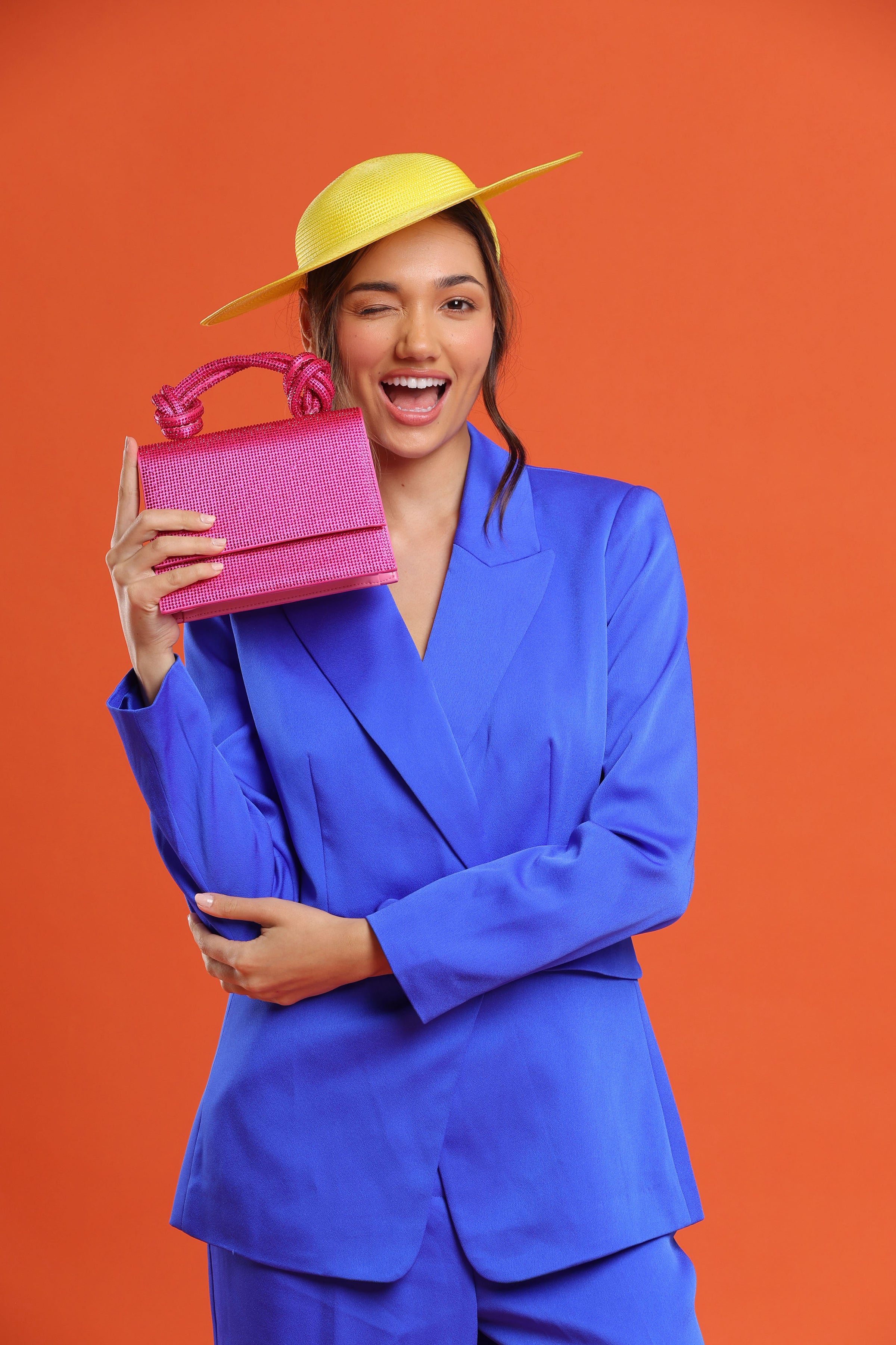 The Arabella Top Handle Bag from Morgan and Taylor in Hot Pink features a classic silhouette with intricate, beaded accents and a knotted handle for an updated look. Boasting press-button closure and PU leather lining, it offers a chic and structured style that adds a touch of sophistication to any ensemble.