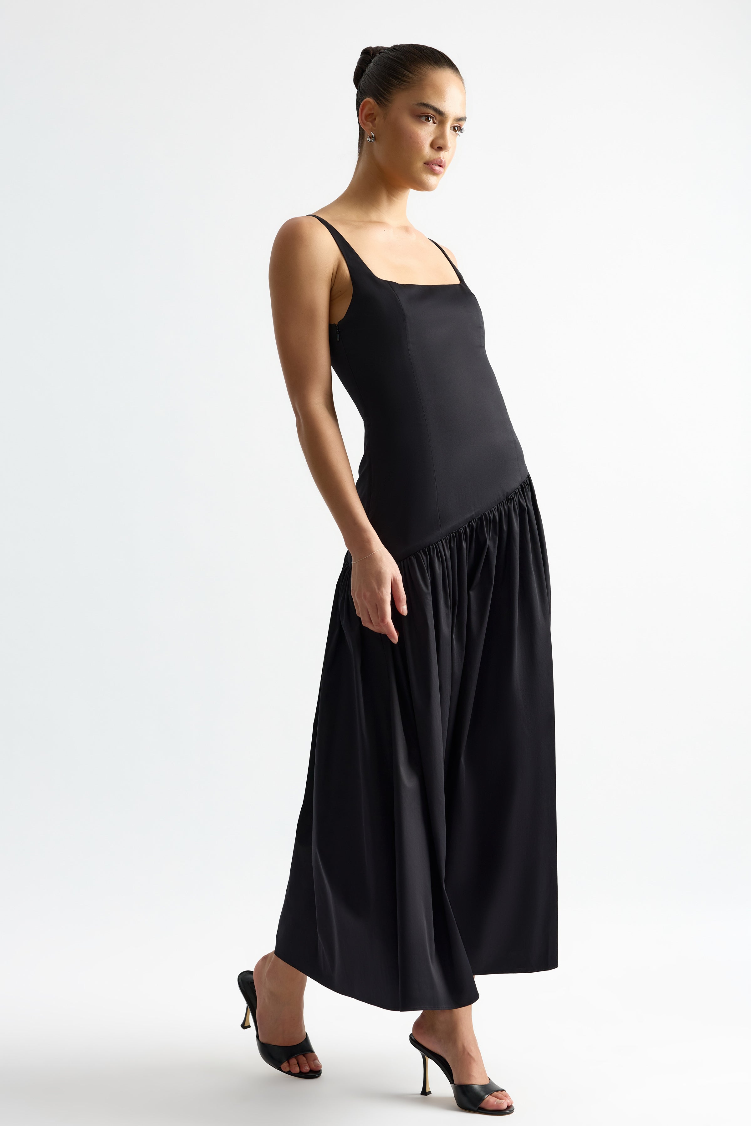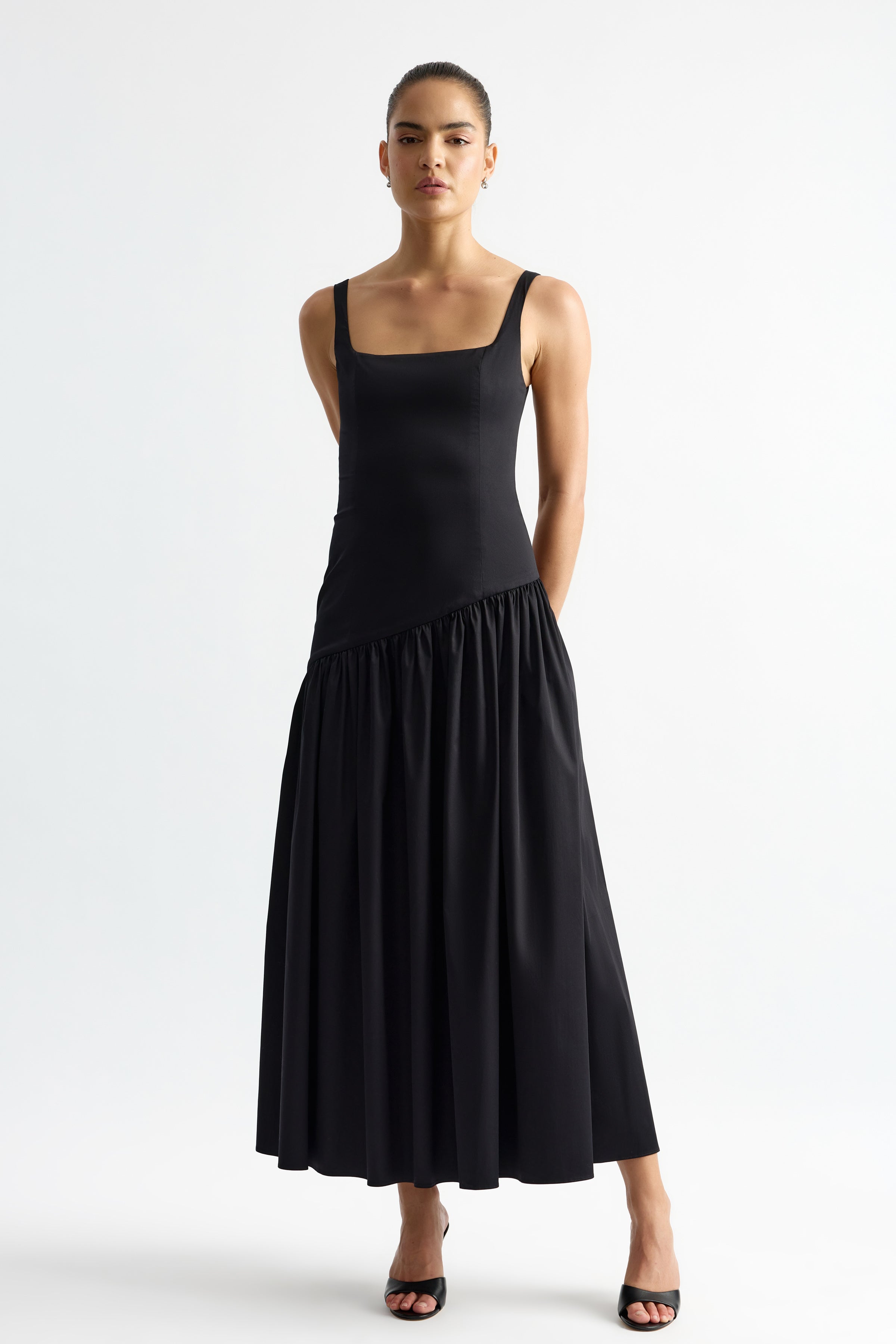 The Caroline Dress is crafted from crisp cotton poplin, featuring a square scooped neckline at both front and back. Princess panels shape the bodice, while an asymmetric seam at the hips flows into a gathered, full skirt, creating movement and a flattering silhouette. Caroline is a contemporary, elegant piece perfect for special occasions.