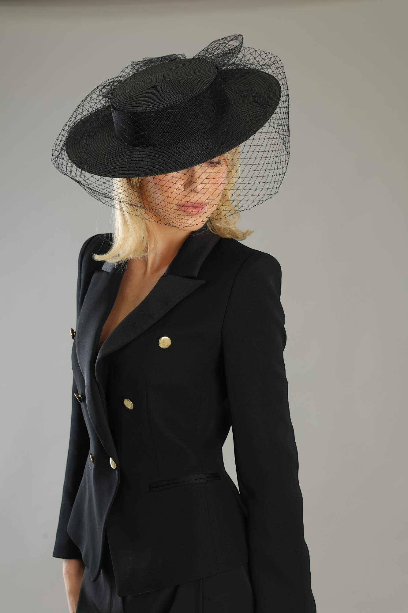 The Morgan & Taylor Danika Racewear Boater in Black blends classic, elegant style with a touch of drama.