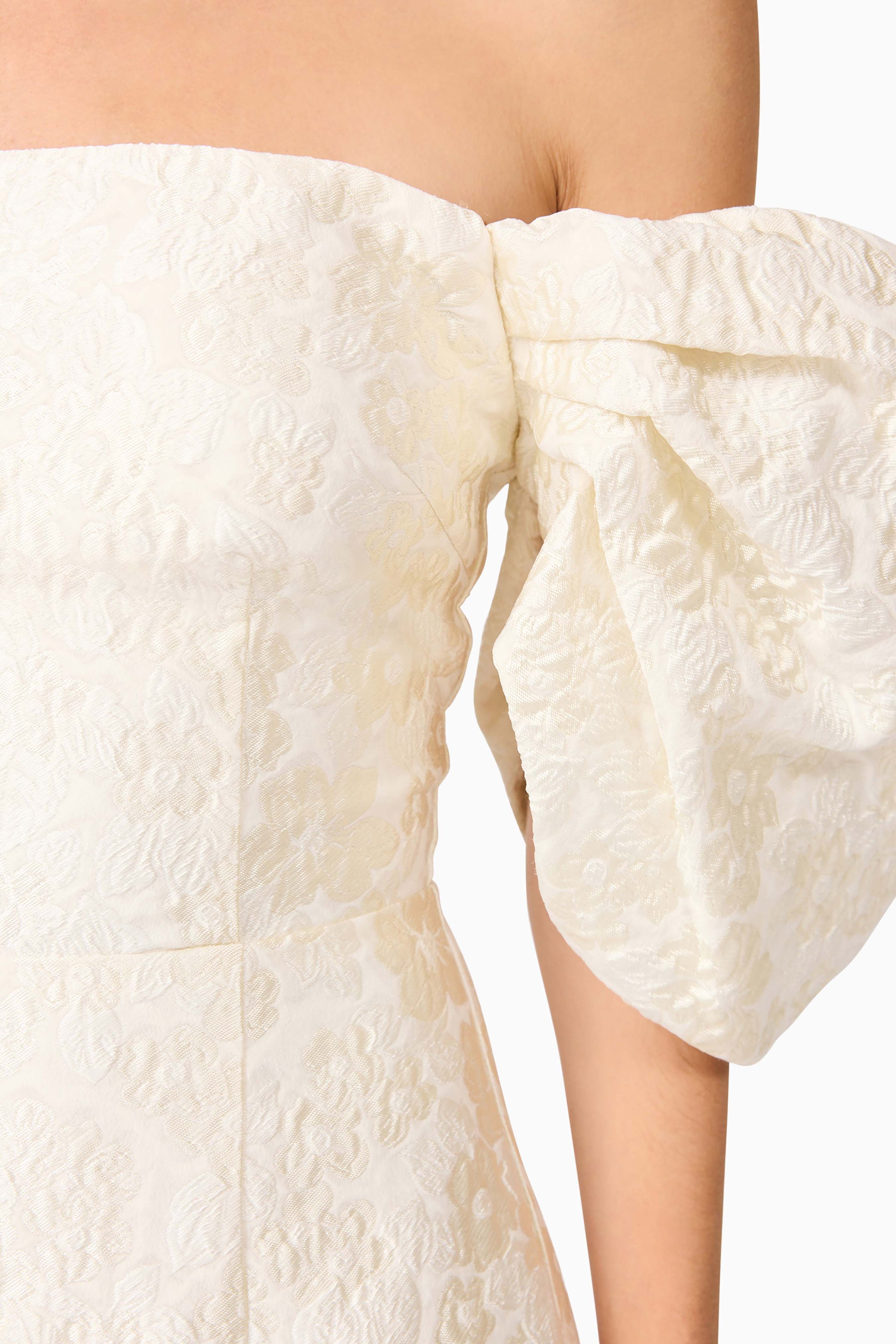 The Galadirel Puff Sleeve Midi Dress in White offers a perfect blend of elegance and modern sophistication. This stunning dress features a strapless neckline that enhances its structured look while showcasing the delicate puff sleeves that add a romantic touch. The jacquard fabrication provides an intricate texture that’s both luxurious and timeless, making this midi dress an ideal choice for any special occasion.