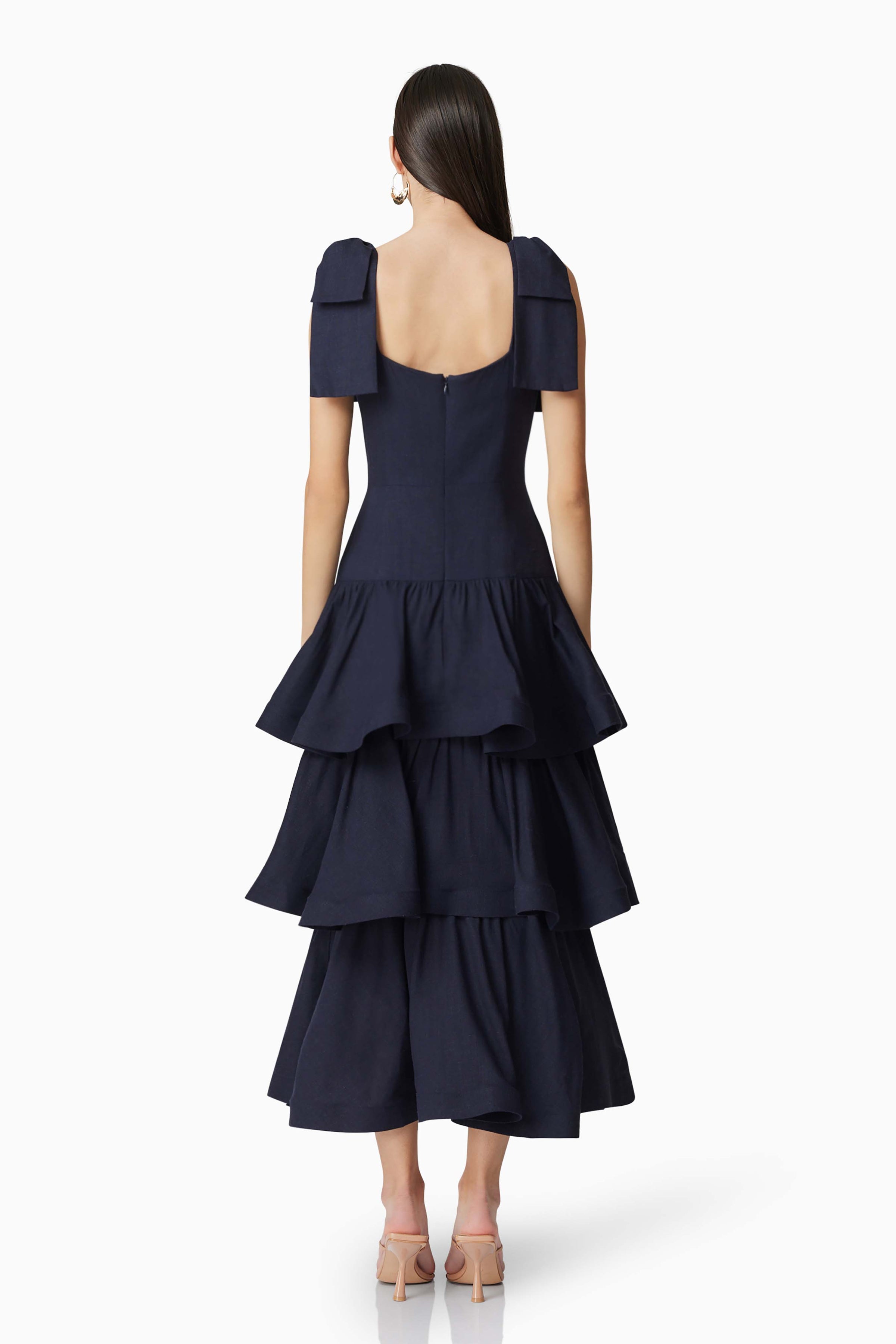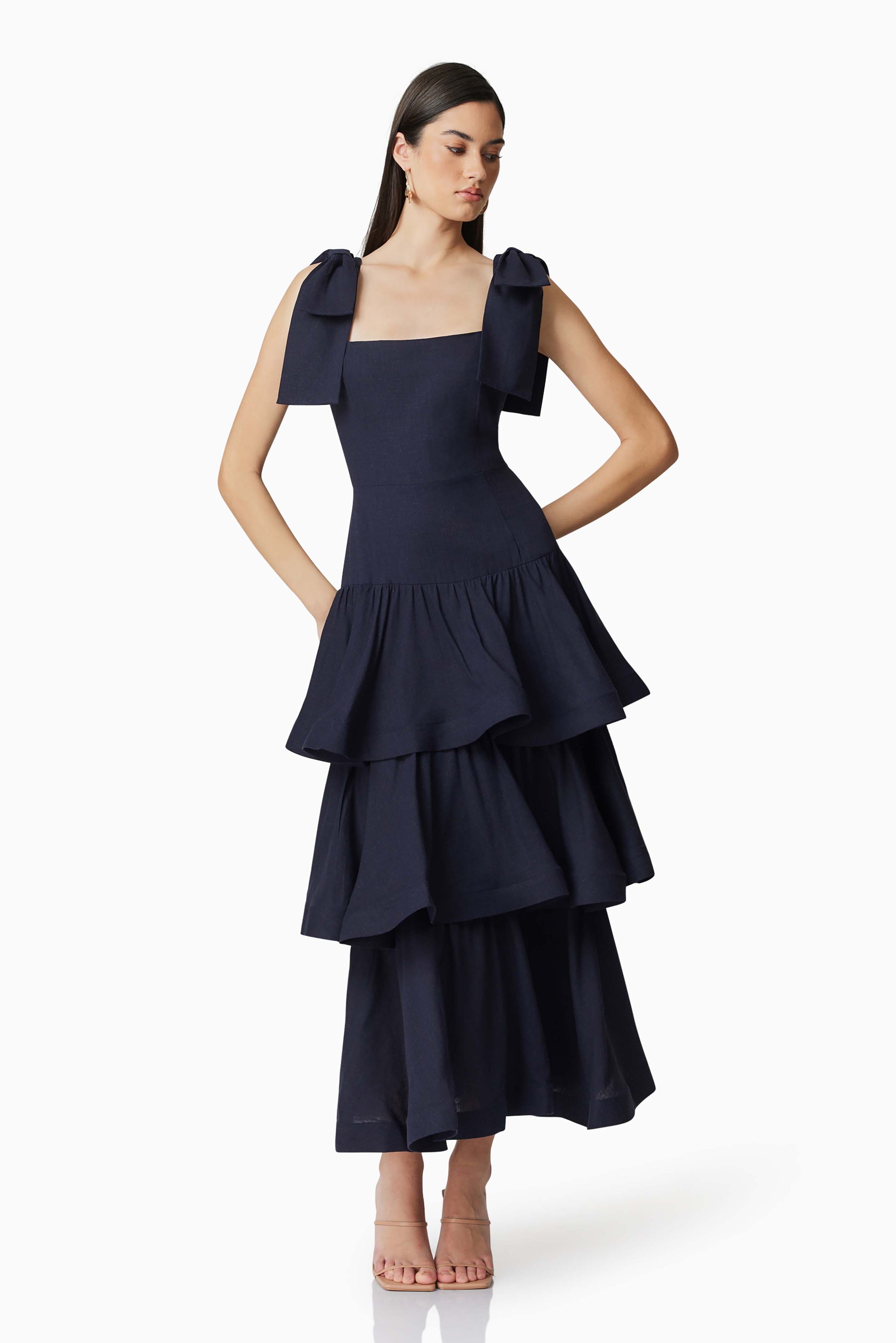 Step into timeless elegance with the Kara Tiered Maxi Dress in navy, a refined yet playful addition to your wardrobe. Designed with a flattering square neckline and charming bow strap details, this dress exudes effortless sophistication. The tiered maxi skirt adds movement and grace, perfect for any occasion, from casual gatherings to evening soirees.