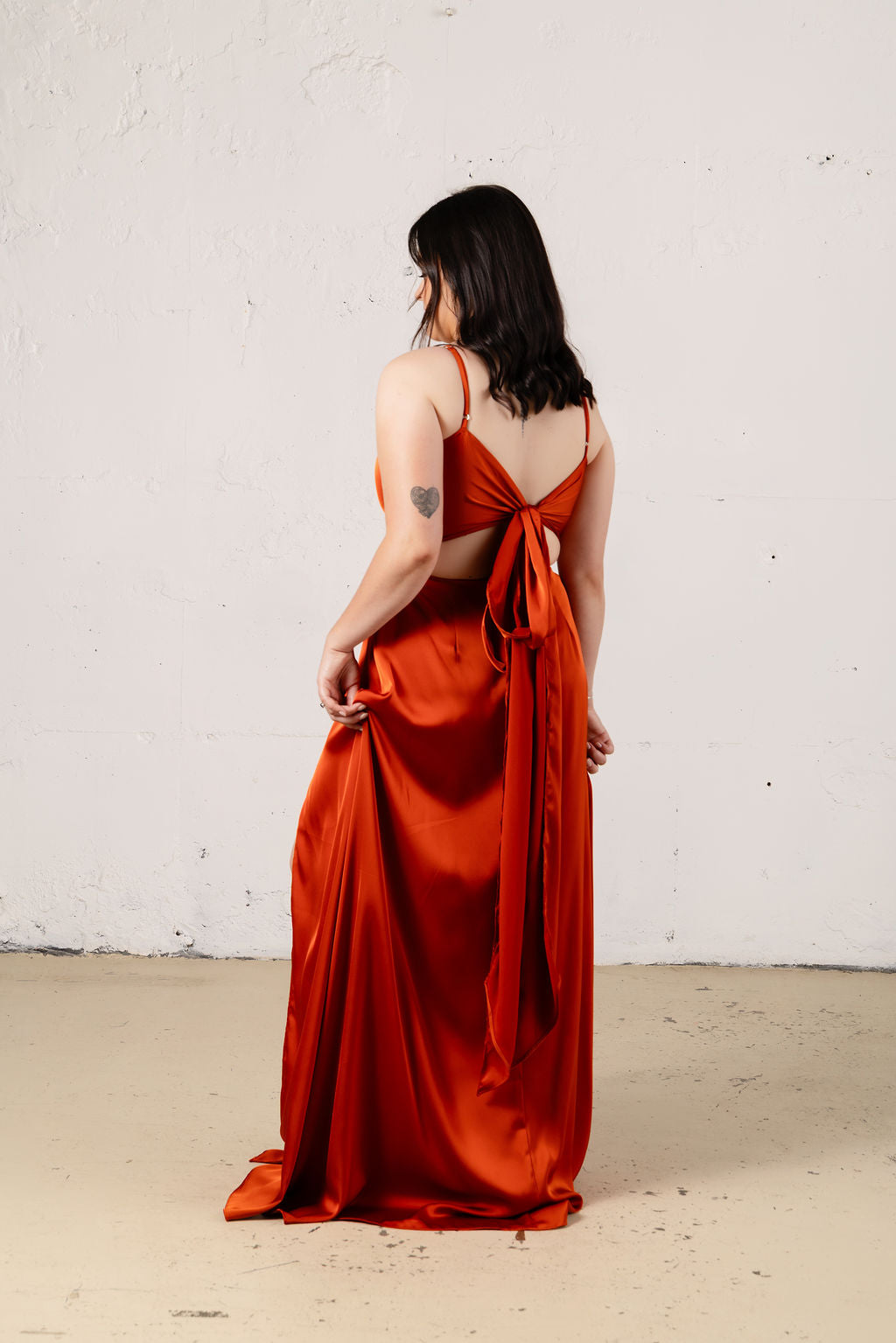 A modern satin gown with a statement bow back and effortlessly elegant silhouette.