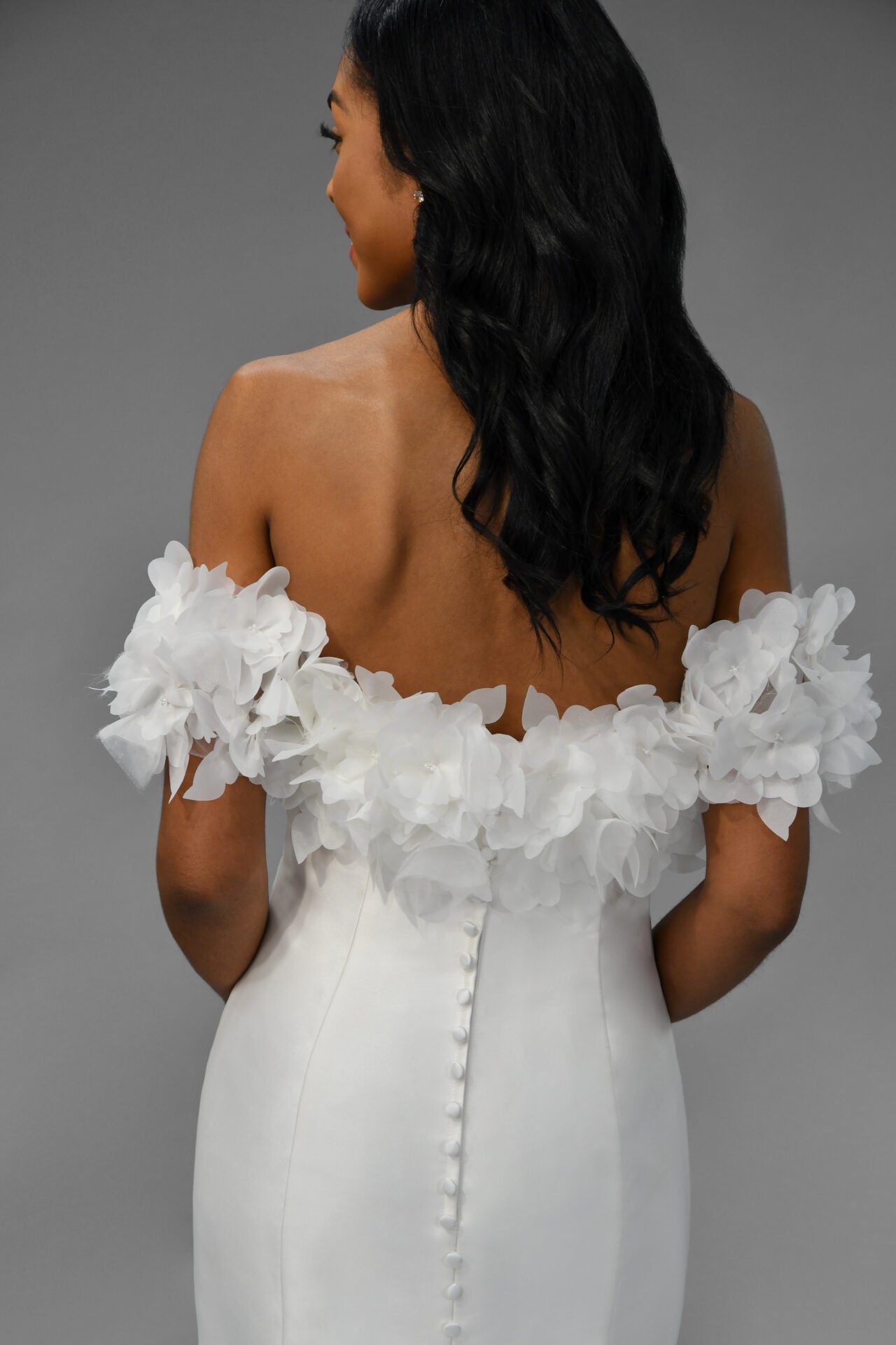 Level up your bridal look with this shawl-style jacket featuring organza flowers and beads. The bodice buttons at the back and the arms have separate holes, creating a luxurious and polished look. Handmade for extra charm!