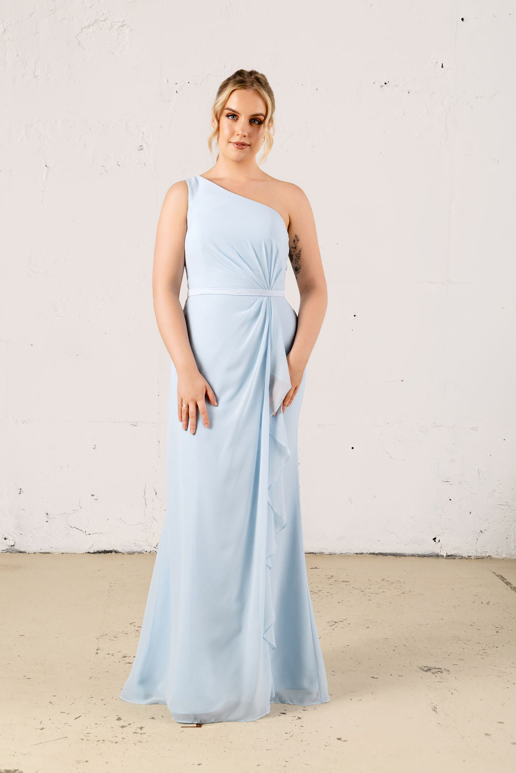 A romantic one-shoulder chiffon gown with soft draping and a cascading ruffle detail.