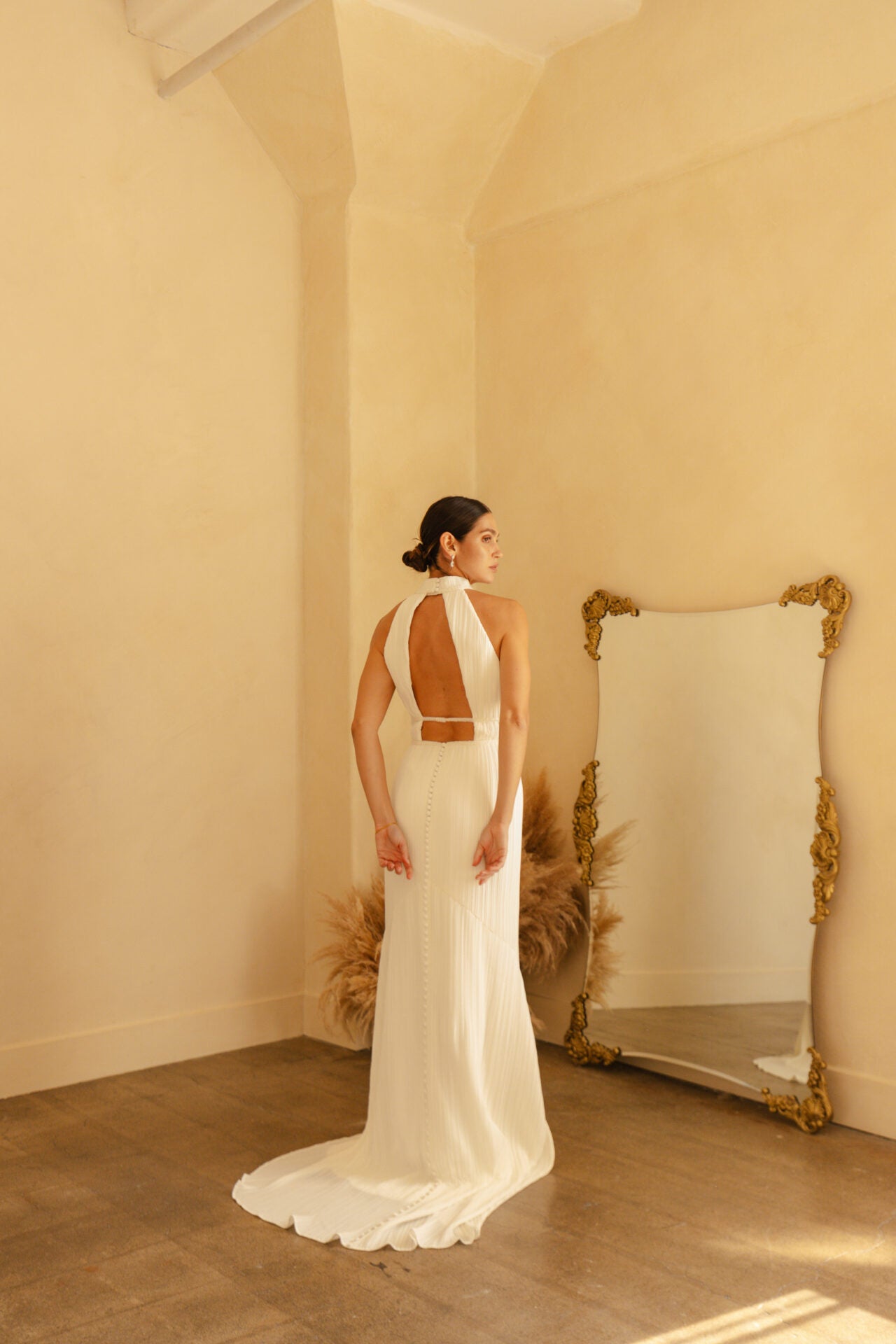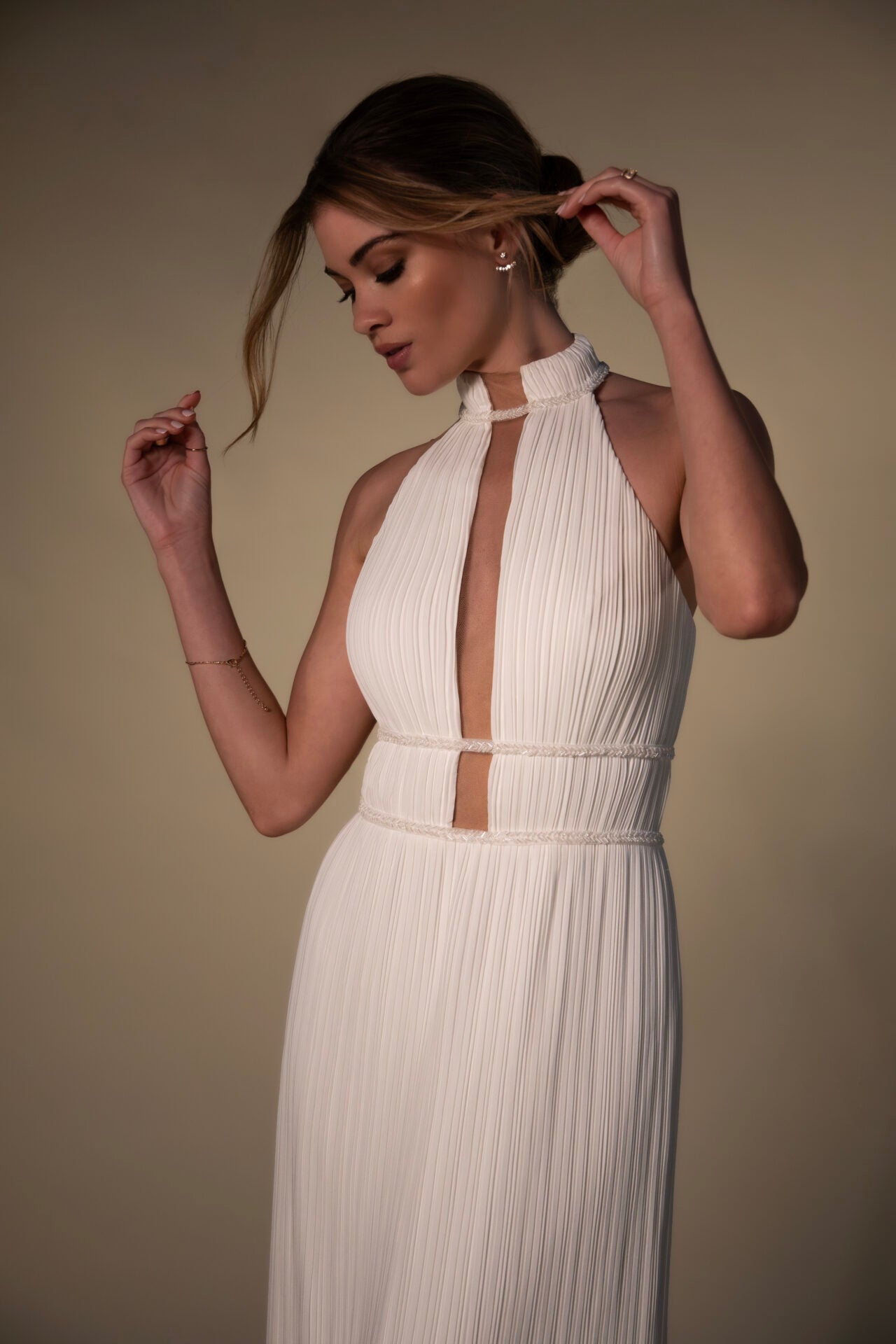 Striking and sophisticated, this modern chiffon wedding dress makes a bold statement for the fashion-forward bride. The rhodes gown features a sleek high halter neckline with a squared plunging detail, adorned with banded beading that evokes the allure of ancient Greek goddesses. Luxe ruched textured chiffon slinks over the figure in a column sheath silhouette, elongating the body with its vertical texture. Balancing elegant simplicity with contemporary design, this high neckline column wedding gown is an ideal match for the modern bride who craves a touch of glamour on that special day.