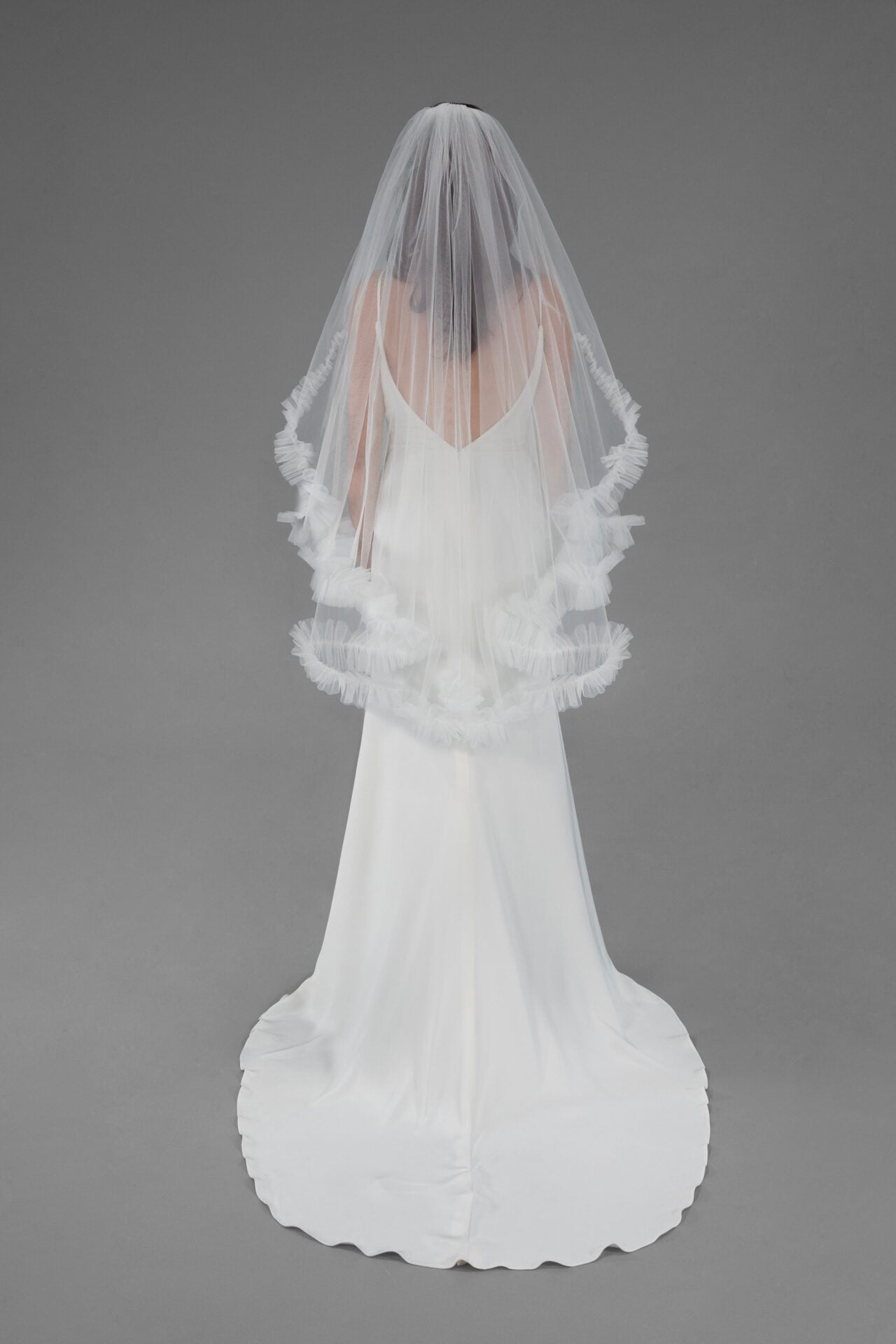 Saoirse is a frilled tulle veil that adds a touch of playfulness and individuality to any bride's ensemble! Intentionally designed for the frill to taper towards the bodice and face to not overshine your beautiful face on your wedding day